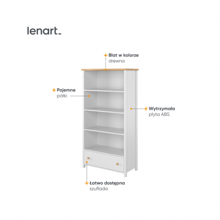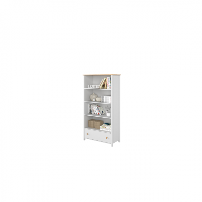 Stylowy regał-biblioteczka na książki, pomoce naukowe i dekoracje. Mebel wyróżnia się oryginalnym charakterem. Bryła w kolorze ej bieli oraz detale o barwie drewna tworzą niepowtarzalny styl, który spodoba się wielbicielkom subtelności inspirowanej stylem prowansalskim.