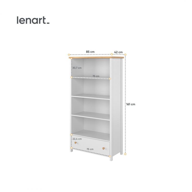 Regał wyposażono w głębokie półki, na których możesz wyeksponować książki, szkolne akcesoria oraz ulubione dekoracje. Na dole zaplanowano szufladę – pojemną i łatwo dostępną również dla dziecięcych rąk.