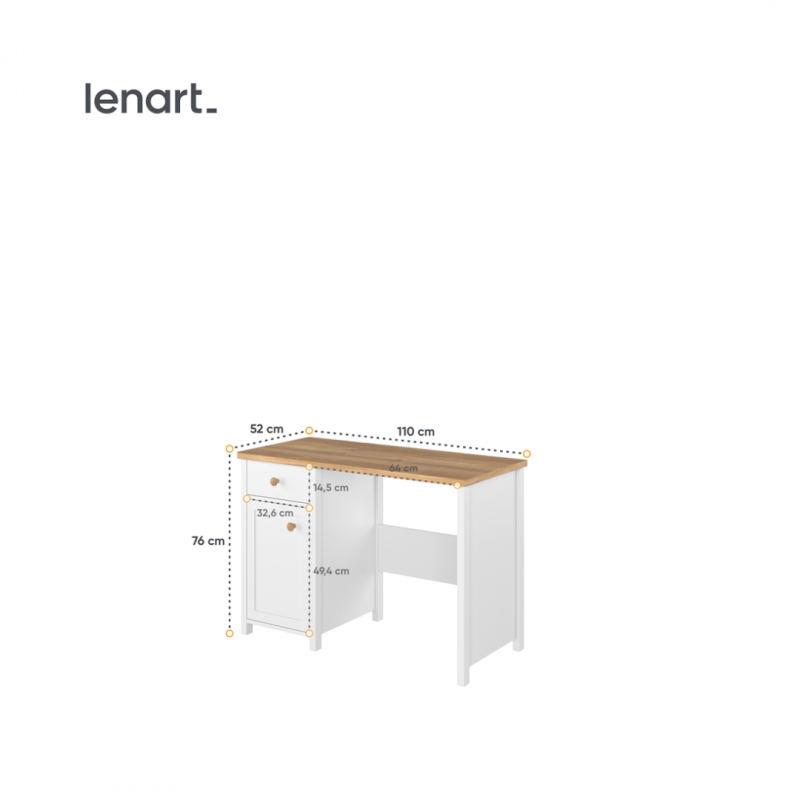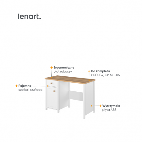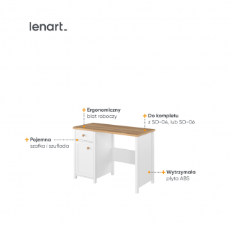 Ergonomiczny blat roboczy zapewnia dużo miejsca do nauki, rysowania i innych prac plastycznych. Pod blatem znajduje się szafka z drzwiami i podręczną szufladą na drobiazgi.