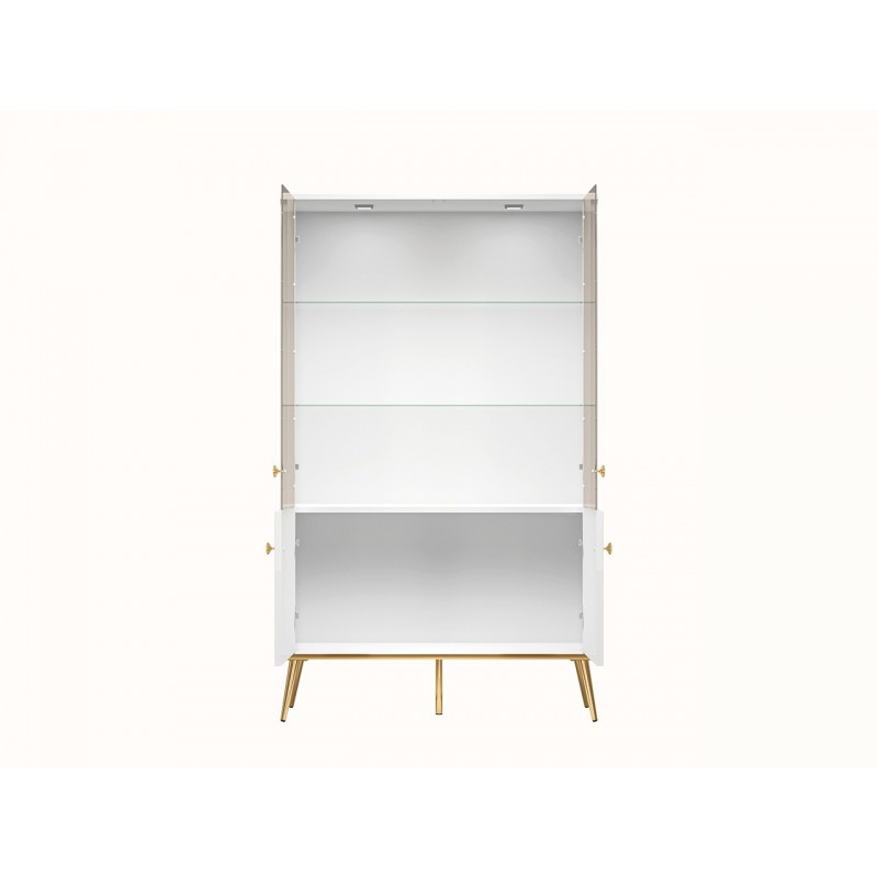 Luksusowe meble, pełne elegancji oraz połysku rozjaśnią wnętrze nowoczesnego salonu jak i sypialni. Skośne stożkowe nóżki w kolorze błyszczącego złota, idealnie komponują się z wieńcem dolnym wykończonym w tym samym odcieniu złota. Delikatne zdobienia na drzwiczkach oraz złote uchwyty stanowią dopełnienie tej pełnej kunsztu oraz szyku kolekcji.