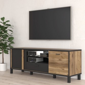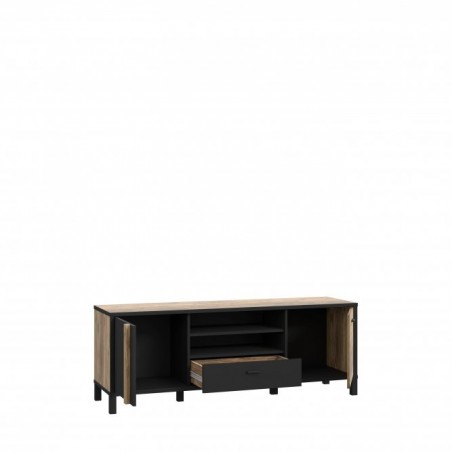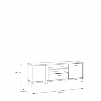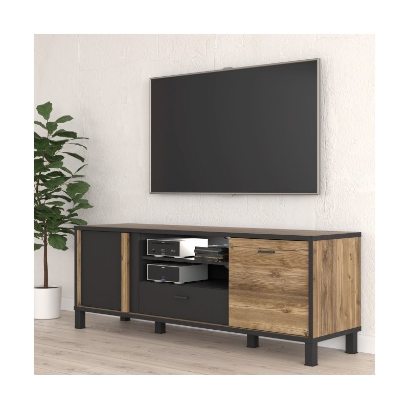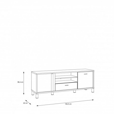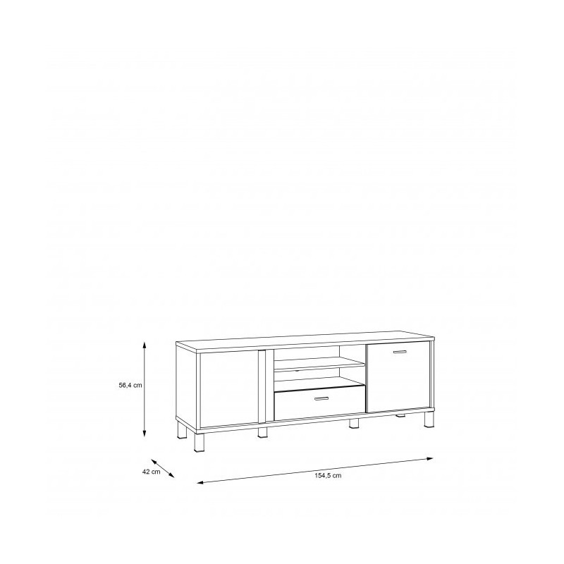 Szafka RTV jest niezbędnym elementem wyposażenia pokoju dziennego. Ta wykonana w subtelnym zestawieniu dekoru Świerk Alpejski wraz z dekorem Czarnym nada każdemu wnętrzu nowoczesnego wyglądu.