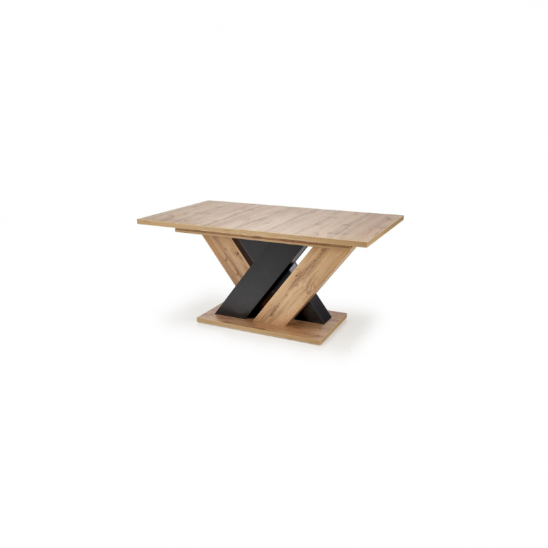 Jest on przede wszystkim funkcjonalny: stoły z płyty laminowanej są bardzo trwałe i łatwe w utrzymaniu czystości. Możesz na nich swobodnie pracować, jeść czy robić różne rzeczy bez obaw o uszkodzenia powierzchni. Ponadto, opcja rozkładana pozwala na dostosowanie stołu do potrzeb i ilości osób. Ciekawy układ nóg, wykonanych z płyty w dwóch kolorach: dąb wotan i czarny wprowadzają do wnętrza unikatowy klimat i są jego niewątpliwą ozdobą. Konstrukcja nóg w formie x, wpływa również na stabilność i wytrzymałość, nie musisz się martwić o niepotrzebne wstrząsy czy przesuwanie.