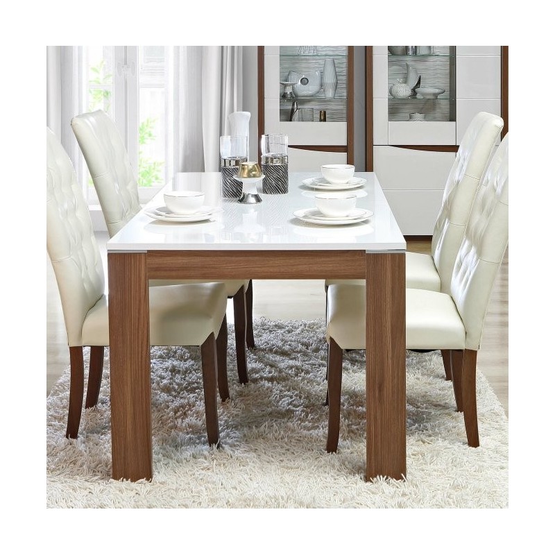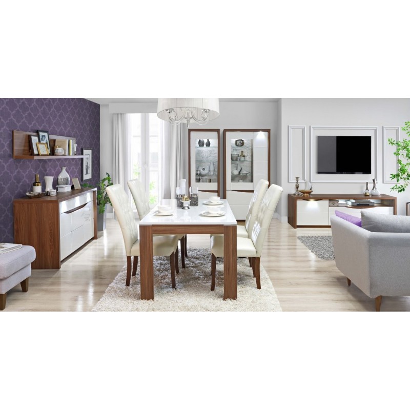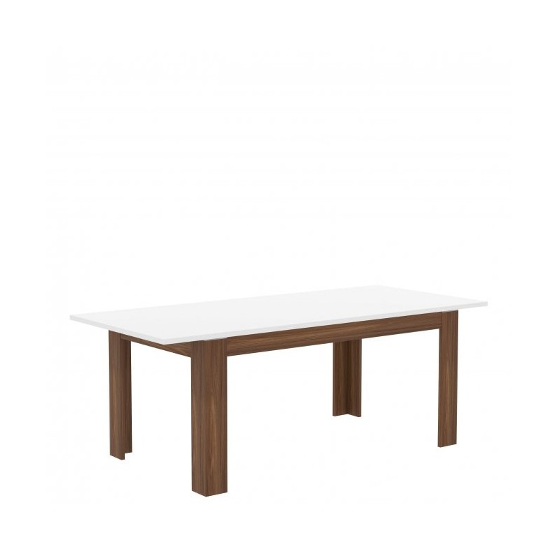 Elegancki stół do stylowej, nowoczesnej jadalni. Dzięki funkcji rozkładania doskonale sprawdzi się zarówno na co dzień, jak i podczas uroczystych, rodzinnych spotkań. Biały blat stołu pięknie komponuje się z nogami stołu w dekorze Dąb Sangallo. Dobierając odpowiedni wzór krzeseł można stworzyć stylowy zestaw.