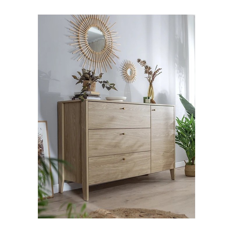 Dzięki naszej nowoczesnej komodzie zyskasz miejsce do przechowywania swoich skarbów. Trzy pojemne szuflady i półka, która znajduje w zamkniętej pojedynczymi drzwiczkami przestrzeni pozwalają na uporządkowanie ubrań, książek, czy akcesoriów, sprawiając, że wszystko jest łatwo dostępne. Na górze znajduje się blat, na którym można postawić zdjęcia, lampkę lub ulubione dekoracje. To idealne rozwiązanie dla tych, którzy cenią porządek i funkcjonalność.