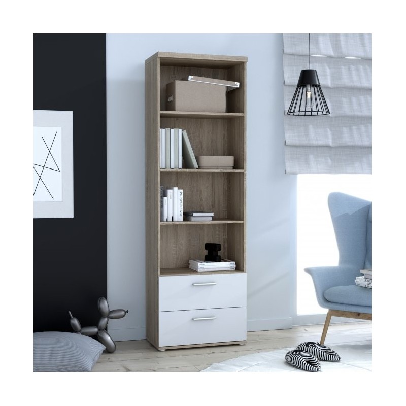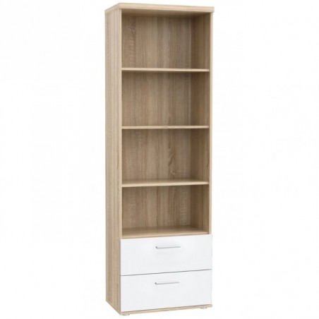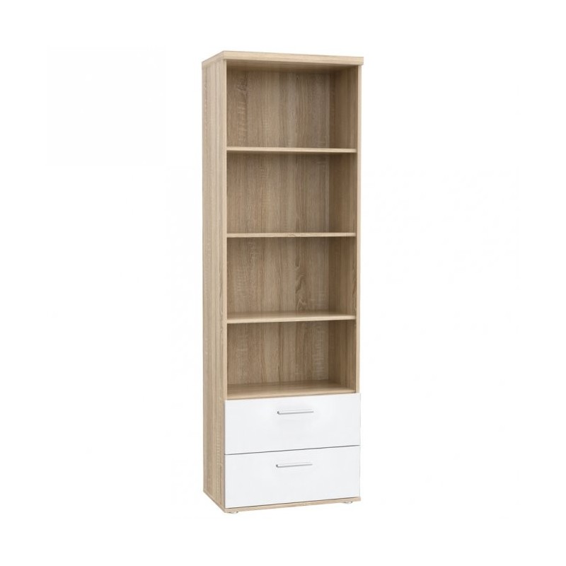 Wąski regał z kolekcji mebli młodzieżowych to mnóstwo miejsca do przechowywania książek, dekoracji i innych drobiazgów. Stawiając go obok biurka zapewni dodatkową przestrzeń dla pomocy szkolnych. Jego kolorystyka dostosowana jest do współczesnych trendów - korpus regału jest w kolorze jasnego drewna połączony z bielą frontów