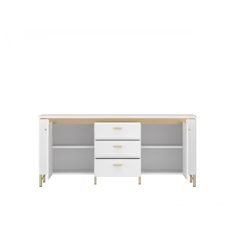 Komoda RTV, prezentowana w ramach kolekcji Lazio jest pojemnym, funkcjonalnym meblem, wpisującym się w przemyślane aranżacje strefy dziennej. Wykonana z płyty laminowanej wiórowej i MDF komoda prezentuje nowoczesne, eleganckie zestawienie bieli z elementami w kolorze złota (zastosowano odcienie Biała Alpejska, Biały Połysk i Złoto). Całość dopełniają stylowe, dodające ponadczasowego luksusu uchwyty i wysokie nóżki, powstałe z metalu, malowane na odcień złoty.