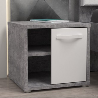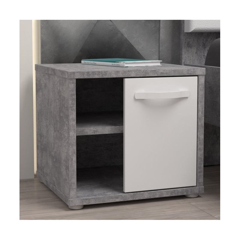 Szafka nocna z tej kolekcji to nowoczesny i praktyczny mebel, który doskonale sprawdzi się zarówno w sypialni, jak i pokoju młodzieżowym. Korpus szafki w dekorze Beton Jasnoszary pięknie kontrastuje z frontem w kolorze Bieli z Połyskiem oraz białym uchwytem.