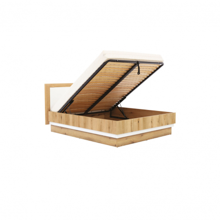Łoże BESTO BT12 to nieodłączny element wyposażenia każdej sypialni. Prezentuje się nowocześnie i stylowo. Łoże posiada metalowy stelaż z funkcją podnoszenia na podnośnikach hydraulicznych, który gwarantuje odpowiednie podparcie materaca na całej jego szerokości. Zostało wyposażone również w duży pojemnik na pościel, materac natomiast należy zakupić osobno. Jasne drewno w połączeniu z białym zagłowiem idealnie pasują do wnętrz jasnych, wzbogaconych drewnianymi elementami dekoracyjnymi. Dostępne w trzech wymiarach: 140 cm,160 cm,180 cm łoże, idealnie sprawdzi się w konfiguracji z innymi bryłami z serii BESTO lub jako pojedynczy mebel, który można dopasować do własnej aranżacji pomieszczenia.