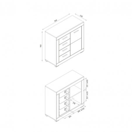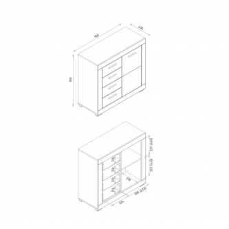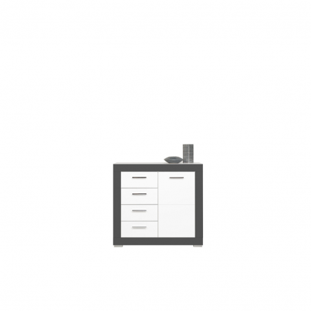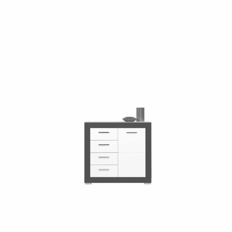 Komoda GRAY GR02 to niewielka komoda o uniwersalnym zastosowaniu. Wyposażona została w pojemną, zamykaną szafkę z dwiema wnękami oraz cztery praktyczne szuflady. Bez problemu pomieścisz w niej wszystkie potrzebne przedmioty. Nowoczesna kolorystyka, w której połączono matową biel i grafit pozwoli stworzyć idealne wnętrze, dostosowane do gustu i wymagań jego użytkowników. Subtelne nóżki w kolorze srebrnym pomogą w zachowaniu czystości pod meblem, dodatkowym atutem komody są wygodne uchwyty wykonane z metalu. Za dopłatą można zamontować system cichego domyku drzwi i szuflad. Komoda idealnie sprawdzi się w konfiguracji z innymi bryłami z serii GRAY lub jako pojedynczy mebel, który można dopasować do własnej aranżacji pomieszczenia.