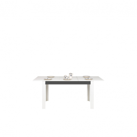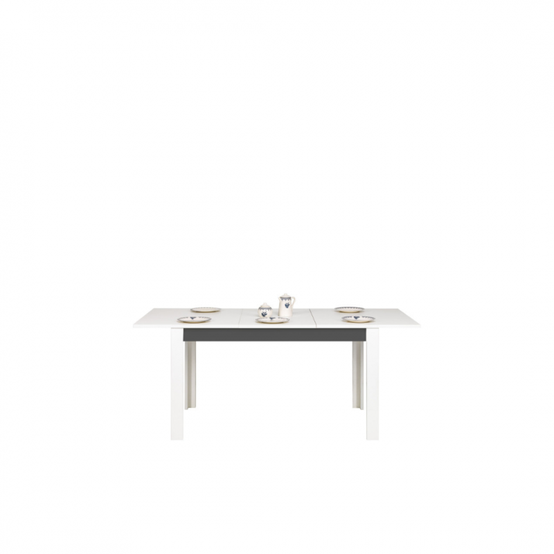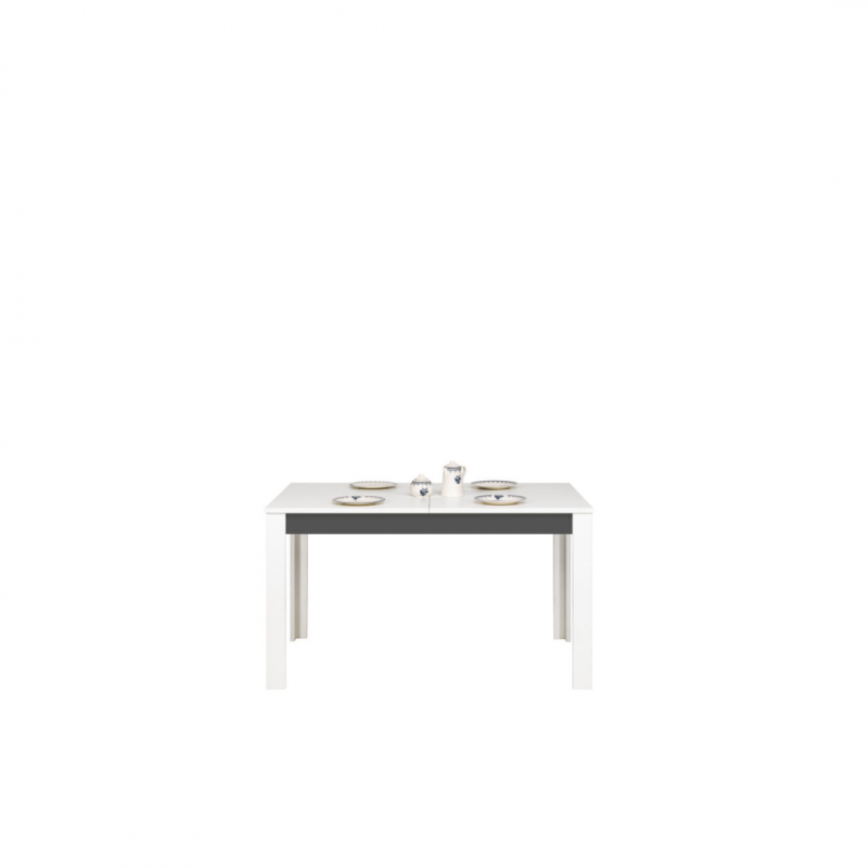 Stół GRAY GR11 to idealny dodatek do salonu oraz jadalni. Jest funkcjonalny i praktyczny, sprawdzi się zarówno w codziennym użytkowaniu jak i podczas większych spotkań rodzinnych. Posiada funkcję rozkładania (wkładka 50 cm) dlatego można go szybko i bez wysiłku rozłożyć do długości 185 cm. Nowoczesna kolorystyka, w której połączono matową biel i grafit pozwoli stworzyć idealne wnętrze, dostosowane do gustu i wymagań jego użytkowników. Stół idealnie sprawdzi się w konfiguracji z innymi bryłami z serii GRAY lub jako pojedynczy mebel, który można dopasować do własnej aranżacji pomieszczenia.