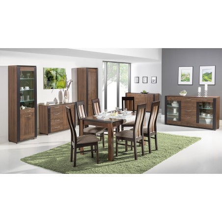 Kolekcja mebli NAOMI łączy w sobie klasyczną elegancję i funkcjonalność, a wraz z niepowtarzalnym wariantem kolorystycznym sprawia, że system doskonale wpasowuje się w każde wnętrze. Jest to kolekcja uniwersalna - można nią wyposażyć pomieszczenia o różnym przeznaczeniu i charakterze, od pokoju dziennego do biura. Korpusy mebli wykonane zostały z wysokiej jakości płyty laminowanej w kolorze orzech. Fronty natomiast wykonane są z płyty MDF pokrytej folią PCV w kolorze orzech/wenge. Zastosowane materiały są odporne na zabrudzenia i zarysowania. Cechami charakterystycznymi tej kolekcji są zaoblone fronty, stylowe drewniane nóżki z chromowaną wstawką oraz wygodne uchwyty wykonane z metalu. W opcji dodatkowej podświetlenie LED witryn oraz system cichego domyku szuflad.