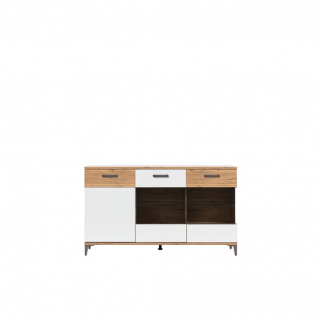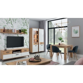 Kredens SNOBI SB05 doskonale sprawdzi się jako mebel funkcjonalny oraz ekspozycyjny w pokoju dziennym, salonie czy jadalni. Szklane fronty w połączeniu ze szklanymi półkami wewnątrz, pozwolą na wyeksponowanie rzeczy w środku. Atutem jest możliwość dobrania zestawu z oświetleniem LED, które podkreśli piękno dekoracji. Za drzwiczkami z lewej strony znajduje się półka, która dzieli przestrzeń na dwie wnęki. Biel w połączeniu z kolorem naturalnego drewna wizualnie ociepli przestrzeń i wprowadzi przytulny klimat nadając meblom lekkości. Dzięki ryflowaniom na froncie szafki, mebel nabiera niezwykłego charakteru. Niewątpliwym atutem kredensu są także ciemne nóżki, ułatwiające utrzymanie porządku, oraz nadające bryle lekkości. Kredens idealnie sprawdzi się w konfiguracji z innymi bryłami z serii SNOBI lub jako pojedynczy mebel, który można dopasować do własnej aranżacji pomieszczenia.