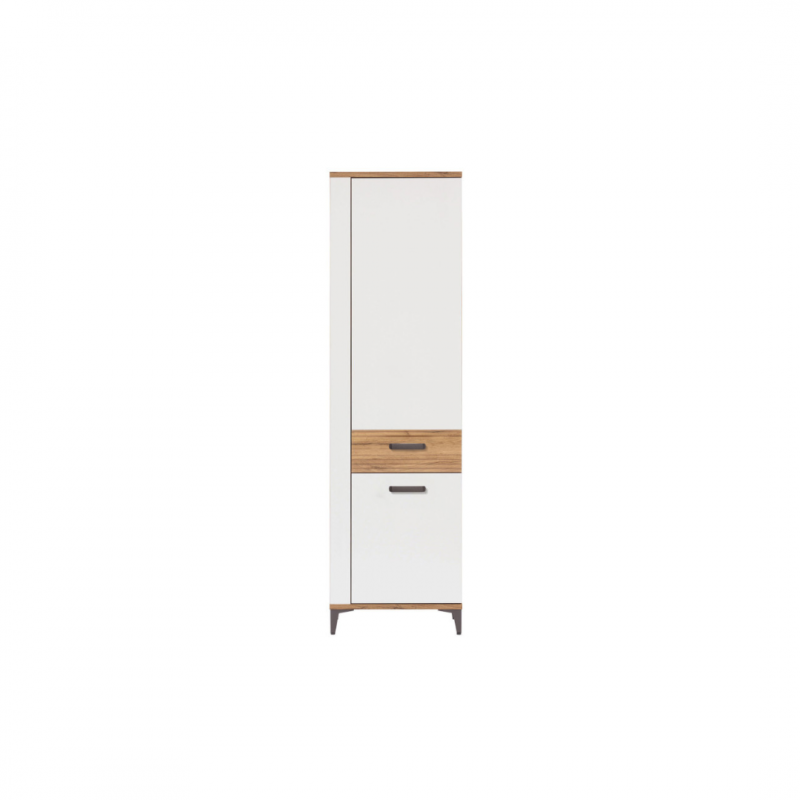 Szafka SNOBI SB10 to unikalny i praktyczny element wyposażenia wnętrz. Jej konstrukcja pozwoli na postawienie jej w salonie, pokoju gościnnym, przedpokoju lub nawet gabinecie. Za zamkniętymi frontami znajdują się pojemne wnęki, które wykorzystasz na przechowywanie segregatorów, dokumentów albo po prostu zastawy stołowej. Szafka jest uniwersalna, drzwiczki mogą otwierać się w lewo lub w prawo. Zgrabnie wyglądający mebel, nie zajmuje wiele miejsca, a jest jednocześnie bardzo pojemny wewnątrz. Dużo bieli, kolor naturalnego drewna wizualnie ociepli przestrzeń i wprowadzi przytulny klimat. Niewątpliwym atutem szafki są także ciemne nóżki, ułatwiające utrzymanie porządku, oraz nadające bryle lekkości. Szafka idealnie sprawdzi się w kompozycji z innymi bryłami z serii SNOBI lub jako pojedynczy mebel, który można dopasować do własnej aranżacji pomieszczenia.