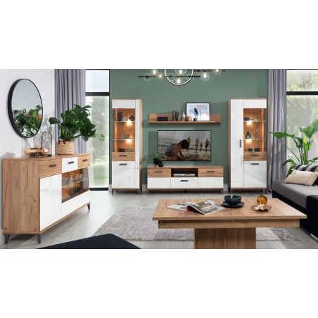 Stwórz przytulne wnętrze, w którym każdy dzień będzie wyjątkowy. Kolekcja SNOBI to meble doskonale wpisujące się w obecne trendy aranżacji wnętrz. Połyskujące fronty w kolorze bieli alpejskiej w połączeniu z ryflowanymi wstawkami w kolorze dąb craft złoty nadadzą elegancji oraz lekkości każdemu pomieszczeniu. System składa się z 14 brył, które można dowolnie łączyć. Całość została wykonana z wysokiej jakości płyty laminowanej oraz MDF zapewniające trwałość mebli oraz ich bezpieczeństwo. W standardzie znajdują się wysokiej jakości prowadnice kulkowe, system cichego domyku (w zawiasie) nóżki z regulacją wysokości oraz hartowane szkło szyb frontowych ( w kolorze antisol brąz). Meble dodatkowo wyposażyć można w podświetlenie LED półek szklanych witryn.