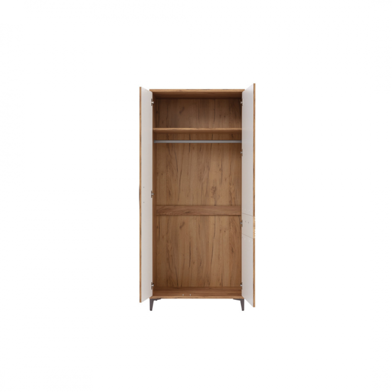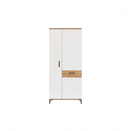Szafa SNOBI SB11 to unikalny i praktyczny element wnętrz - można nią wyposażyć pomieszczenia o różnym przeznaczeniu i charakterze, od pokoju dziennego po biuro. Ze względu na swoje kompaktowe gabaryty, sprawdzi się także w niewielkiej sypialni. Wyposażona w drążek na wieszaki i półkę, szafa SNOBI pozwoli łatwo uporządkować nie tylko ubrania. Dużo bieli, kolor naturalnego drewna wizualnie ociepli przestrzeń i wprowadzi przytulny klimat. Niewątpliwym atutem szafy są także ciemne nóżki, ułatwiające utrzymanie porządku, oraz nadające bryle lekkości. Szafa idealnie sprawdzi się w kompozycji z innymi bryłami z serii SNOBI lub jako pojedynczy mebel, który można dopasować do własnej aranżacji pomieszczenia.