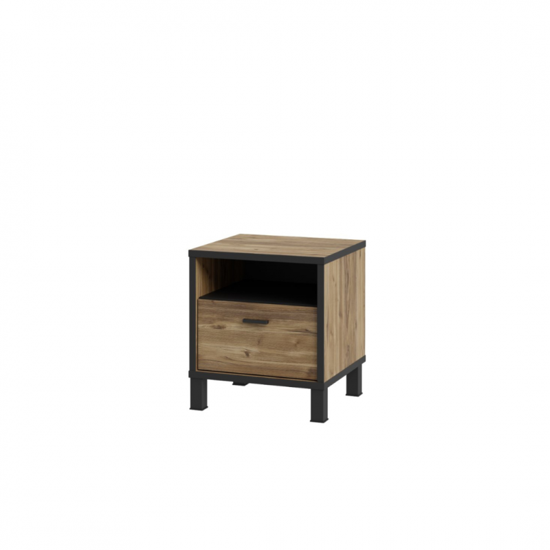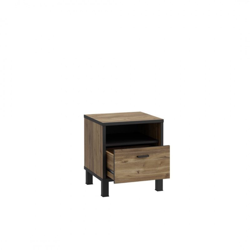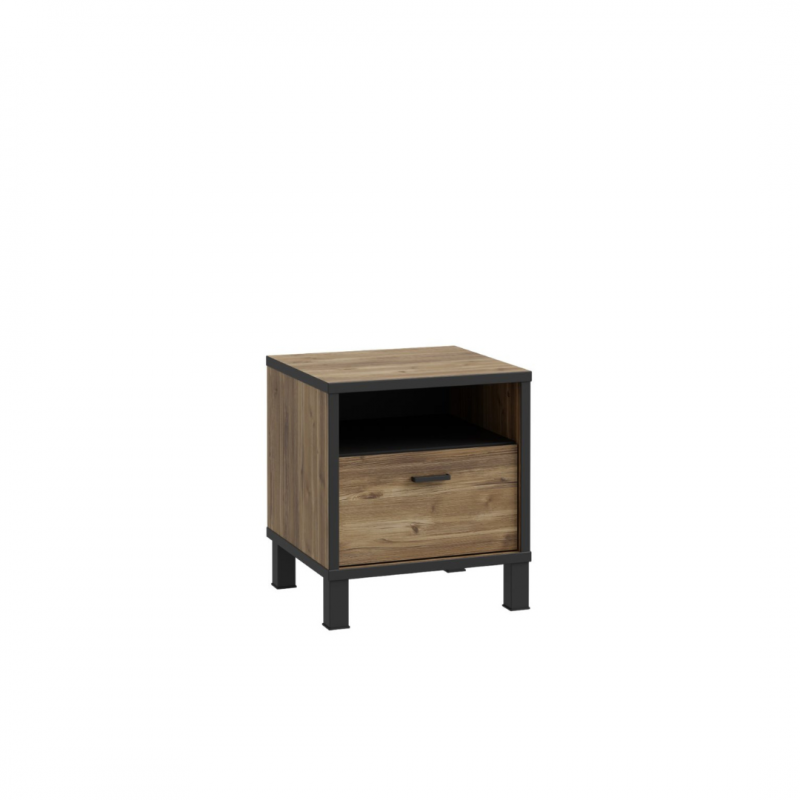 Szafka nocna HAYATO doskonale sprawdzi się w towarzystwie dwuosobowego łóżka, tworząc spójną aranżację w stylu modern loft. Wyposażona w podręczną szufladę zapewnia miejsce do przechowywania prywatnych rzeczy, np. leków, natomiast w otwartej wnęce możesz przechowywać aktualnie czytaną lekturę. Praktyczny blat to miejsce na lampkę nocną, budzik i szklankę wody. Połącz szafkę HAYATO z pozostałymi elementami kolekcji.