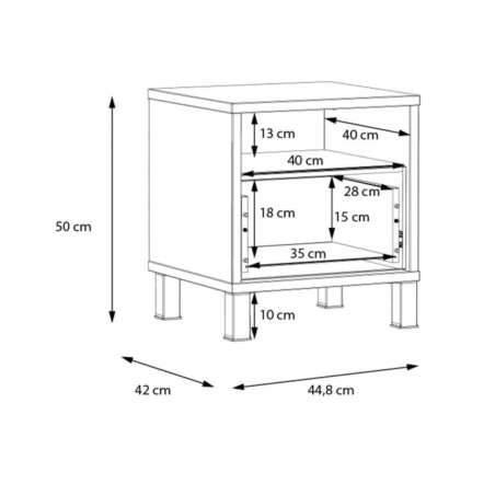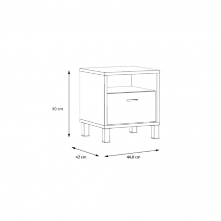 - Szafka nocna o wymiarach 44,8 cm szerokości, 50 cm wysokości i 42 cm głębokości dopełni nawet niewielką sypialnię