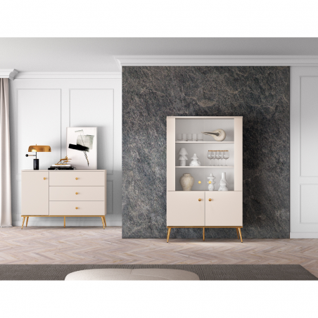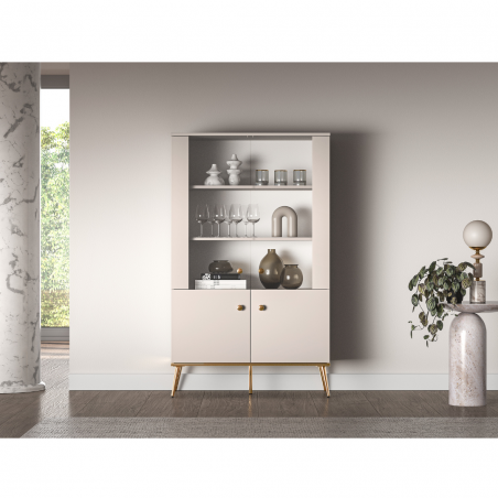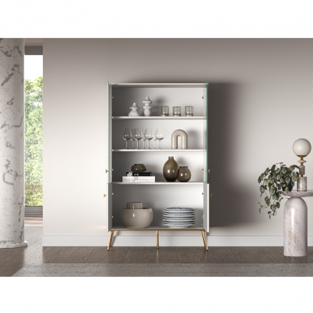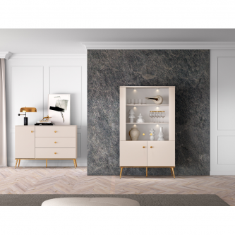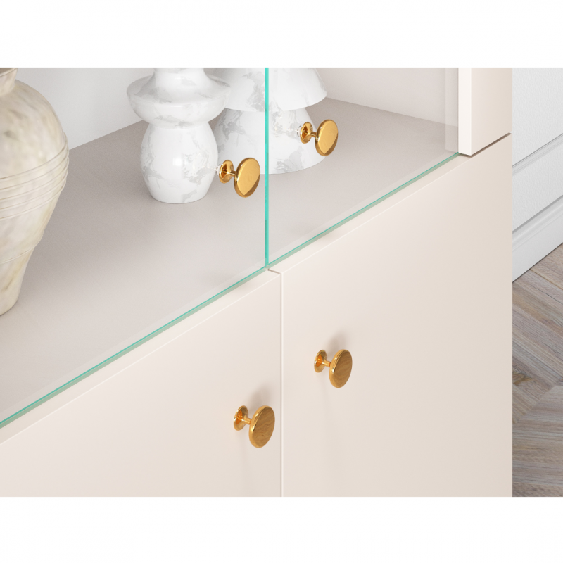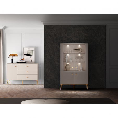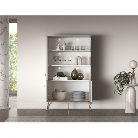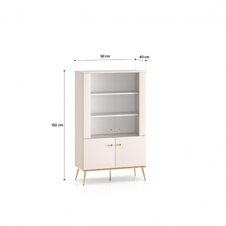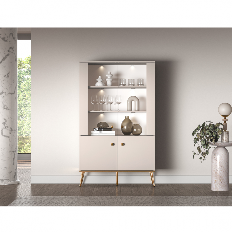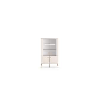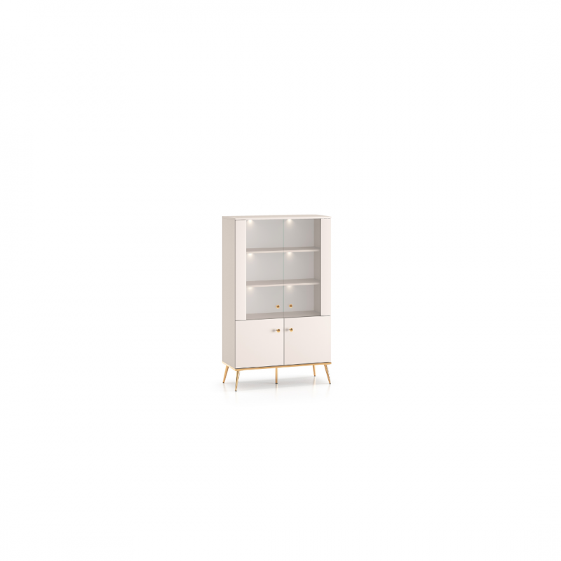Witryna Selgin 02 to mebel, dzięki któremu wyeksponujesz swoje ulubione przedmioty. Dwie półki dzielą przestrzeń na cztery wnęki zamykane podwójnymi, przeszklonymi drzwiami. Ustawisz w nich kieliszki, kolekcję porcelany lub pamiątki z podróży. Dolną część mebla tworzy pojemna półka, na której przechowasz zastawę stołową lub obrusy. Nożny włącznik światła. . Bryła mebla posadowiona jest na stabilnych, wysokich nóżkach wykonanych z wytrzymałego metalu. Podwójnie galwanizowane uchwyty oraz nogi w złotym wybarwieniu gwarantują wieloletnie, wygodne użytkowanie. Meble z kolekcji Selgin łączą w sobie wysoką funkcjonalność z zachwycającym designem.