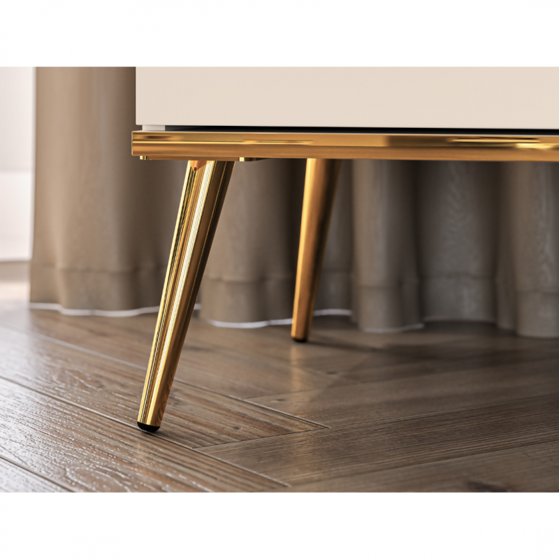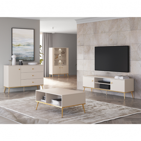 Meble z kolekcji Selgin charakteryzują się wyjątkowym designem łączącym minimalizm z wyrafinowanymi, złoconymi dodatkami. Jasnobeżowy, kaszmirowy dekor brył w połączeniu z uchwytami, nóżkami oraz okleiną wieńca dolnego w kolorze złotym doskonale wkomponuje się we współczesne wnętrze.