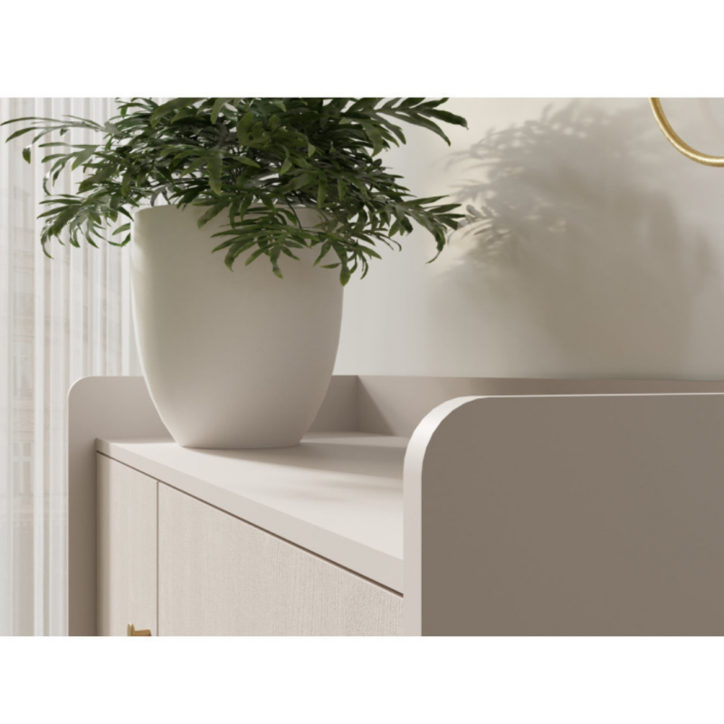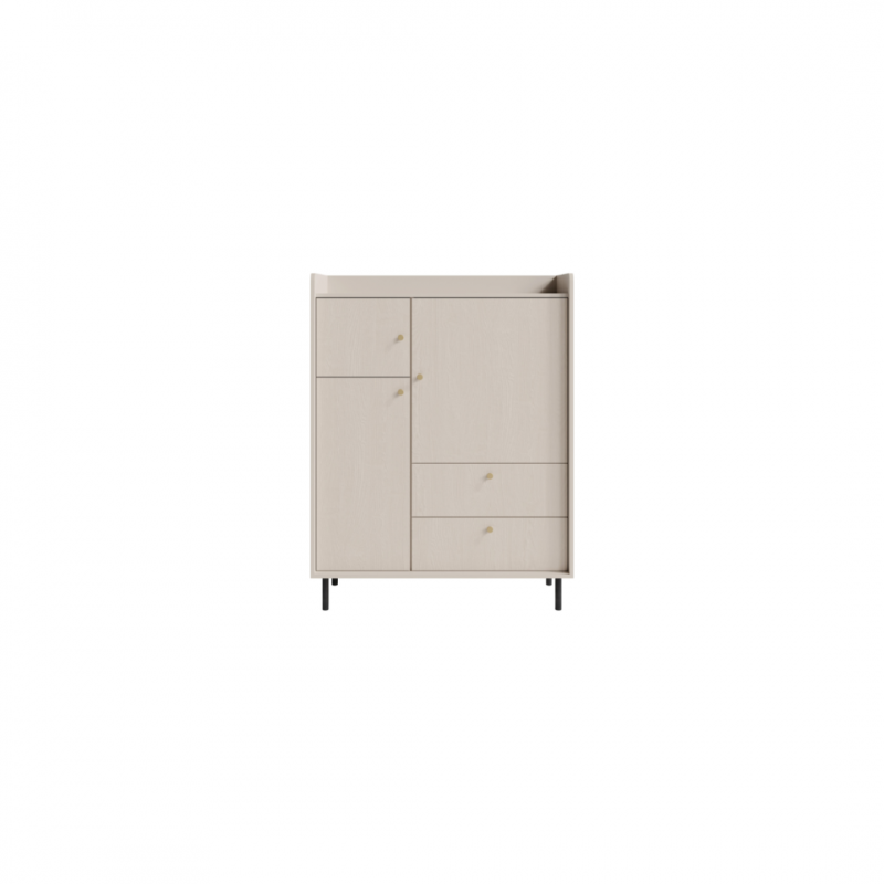 Komoda GR1 z kolekcji Grande od producenta Meblar to elegancki mebel, który doskonale łączy nowoczesny design z funkcjonalnością. Wykonana z wysokiej jakości laminowanej płyty o grubości 16 mm, zapewnia trwałość i odporność na uszkodzenia. Jej powierzchnia wykończona jest w piaskowym odcieniu beżu, łącząc gładkie elementy z subtelną strukturą drewna na frontach, co nadaje jej unikalny charakter. Dodatkowo, komoda wyposażona jest w solidne, czarne, metalowe nóżki oraz minimalistyczne uchwyty w złotym kolorze, które podkreślają jej nowoczesny styl.