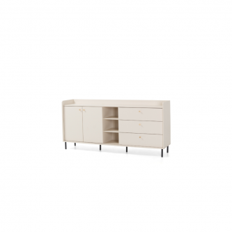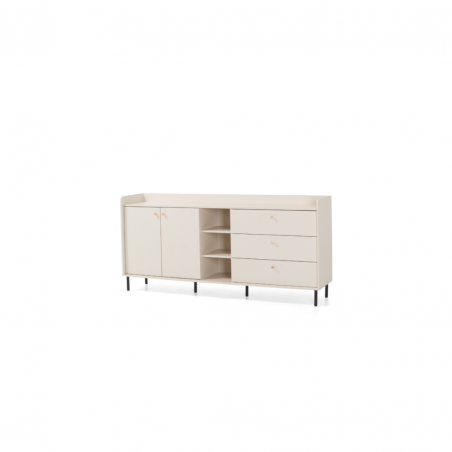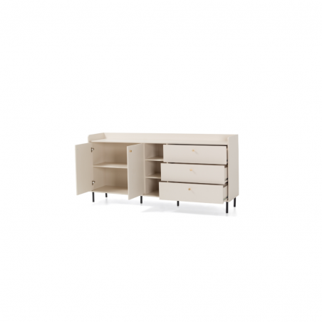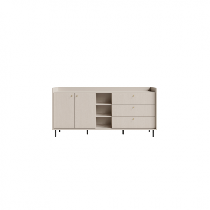 Funkcjonalność komody GR4 przejawia się w przemyślanej organizacji przestrzeni przechowywania. Mebel posiada trzy szuflady, otwarte wnęki oraz półki ukryte za drzwiczkami, umożliwiające uporządkowane przechowywanie różnych przedmiotów. Wymiary komody to 193,5 cm szerokości, 91 cm wysokości i 42 cm głębokości, co czyni ją przestronnym, ale jednocześnie eleganckim rozwiązaniem do salonu, sypialni czy gabinetu. Dodatkowym atutem jest podwyższona krawędź górnej powierzchni, zapobiegająca przypadkowemu zsunięciu się przedmiotów.