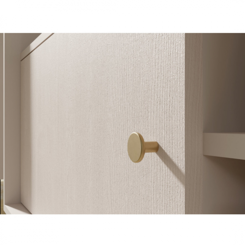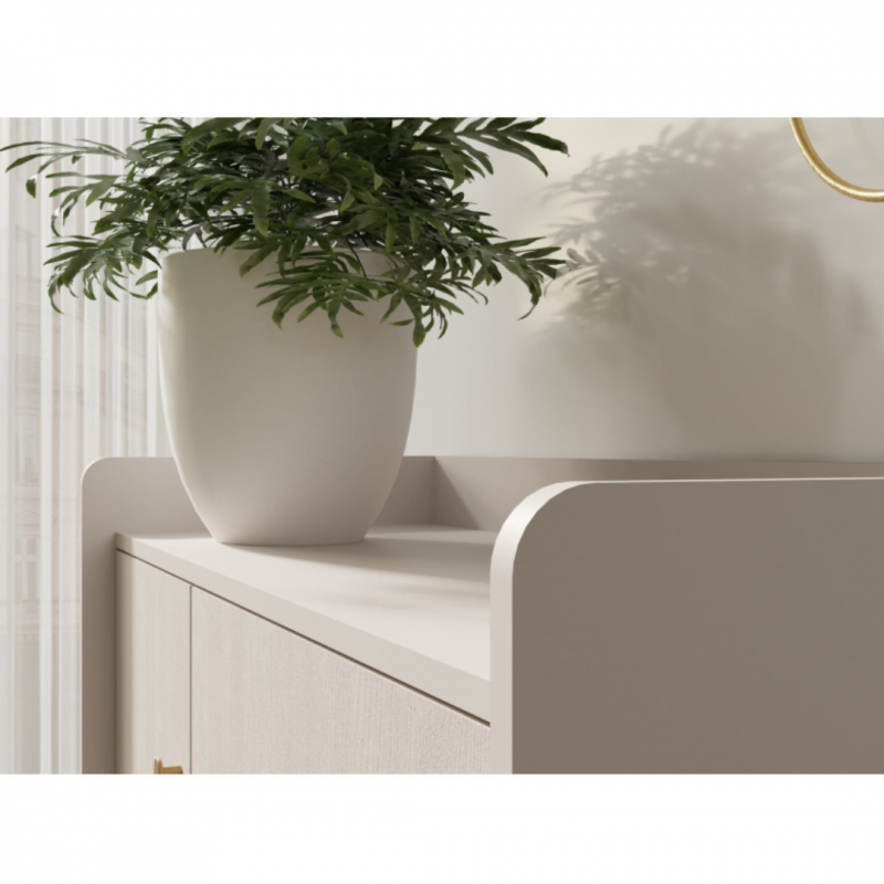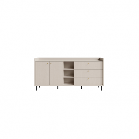 Komoda GR4 z kolekcji Grande od producenta Meblar to elegancki i funkcjonalny mebel, który doskonale wpasuje się w nowoczesne wnętrza. Wykonana z wysokiej jakości laminowanej płyty o grubości 16 mm, zapewnia trwałość i odporność na uszkodzenia. Jej powierzchnia wykończona jest w piaskowym odcieniu beżu, łącząc gładkie elementy z subtelną strukturą drewna na frontach, co nadaje jej unikalny charakter. Dodatkowo, komoda wyposażona jest w solidne, czarne, metalowe nóżki oraz minimalistyczne uchwyty w złotym kolorze, które podkreślają jej nowoczesny styl.