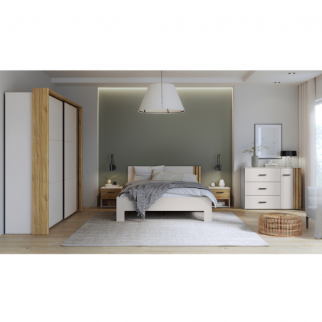 Dla tych, którzy marzą o schludnej, estetycznej przestrzeni sypialni w stylu skandynawskim, oferujemy kolekcję WAIKATO. W jej ramach znajduje się solidne, dwuosobowe łóżko, szafka nocna, pojemna szafa i komoda. Dzięki takiej kompozycji mebli, zyskujesz miejsce do odpoczynku i przechowywania – wszystko to, czego potrzebujesz w sypialni. Całość utrzymana jest w kolorze piaskowym i dekorze dębu, wykorzystanego w lamelach.