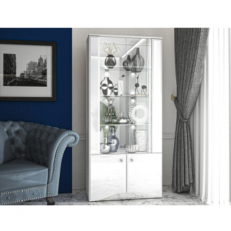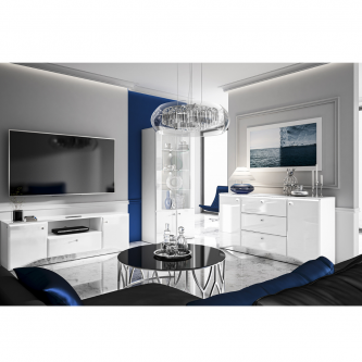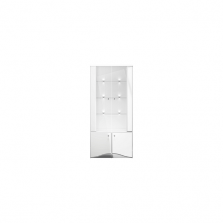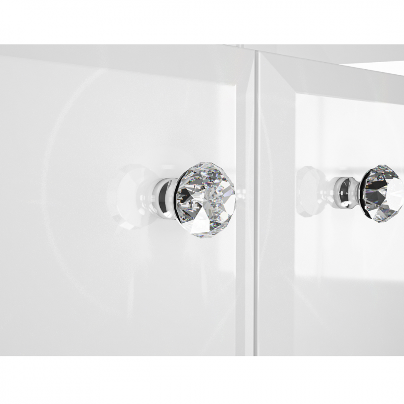 Styl mebli podkreślają zaokrąglone fronty w białym połysku wykonane z płyty MDF oraz lustrzany cokół, który przyjmuje kolorystykę otoczenia. Luksusowy charakter mebli tworzy również oświetlenie LED - dodające wnętrzu oryginalnego klimatu - oraz wygodne zawiasy z cichym domykaniem. Całości dopełnia zestaw chromowanych uchwytów z imitacją diamentu - rozpraszają one światło tworząc magiczny efekt.