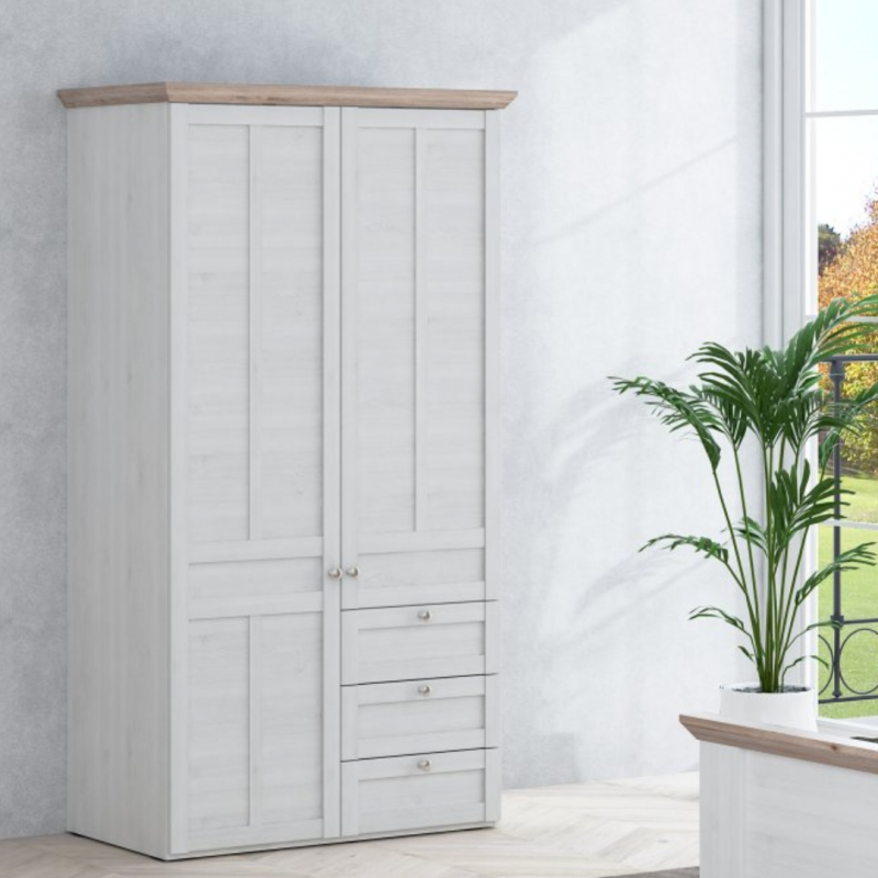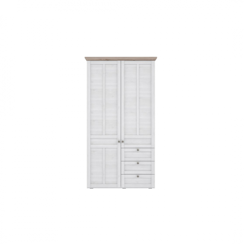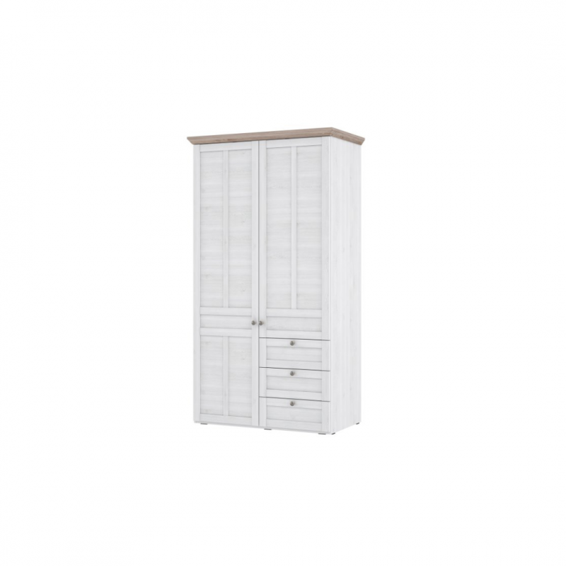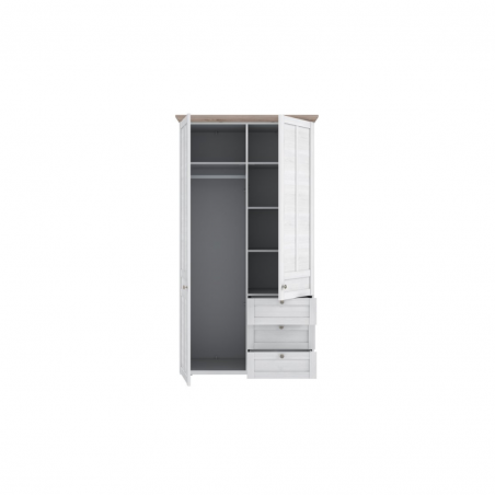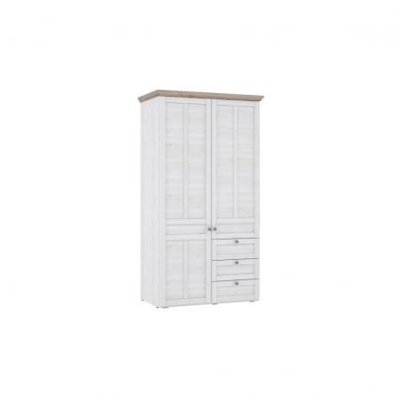 Dwudrzwiowa szafa ubraniowa w stylu prowansalskim z kolekcji ILOPPA wykonana jest w połączeniu dekorów: Dębu Śnieżnego i Dębu Nelson. Mebel wyróżnia się bogatymi zdobieniami, ramkowymi frontami, finezyjnie wyfrezowanym wieńcem górnym i maswnym cokołem. Szafa posiada trzy samodomykające się szuflady, cztery półki oraz drążek na wieszaki. Mebel świetnie będzie prezentował się w sypialni lub salonie w towarzystwie pozostałych mebli z kolekcji. Szafa wyposażona jest w system cichego domyku.