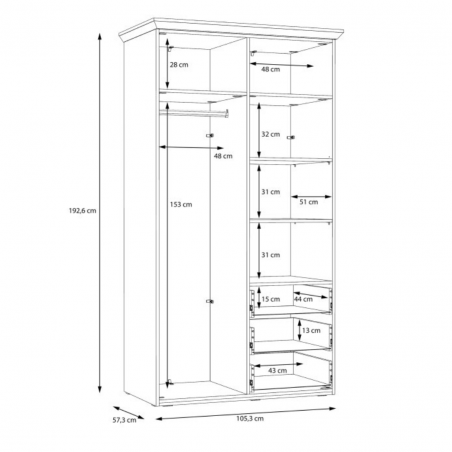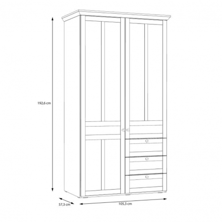- Szafa o wymiarach: 105,3 cm szerokości, 192,6 cm wysokości oraz 57,3 cm głębokości