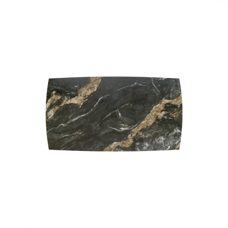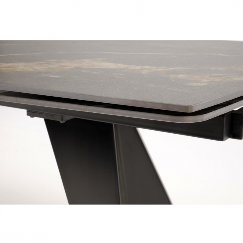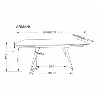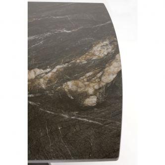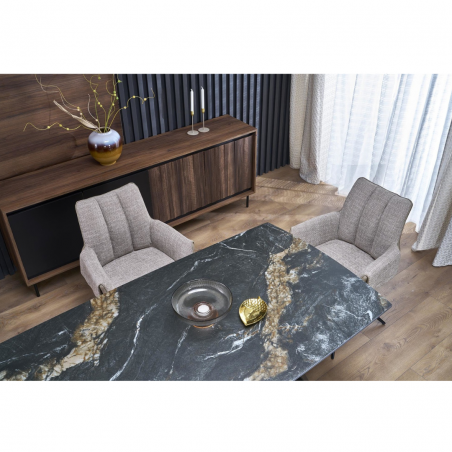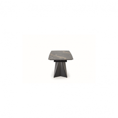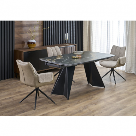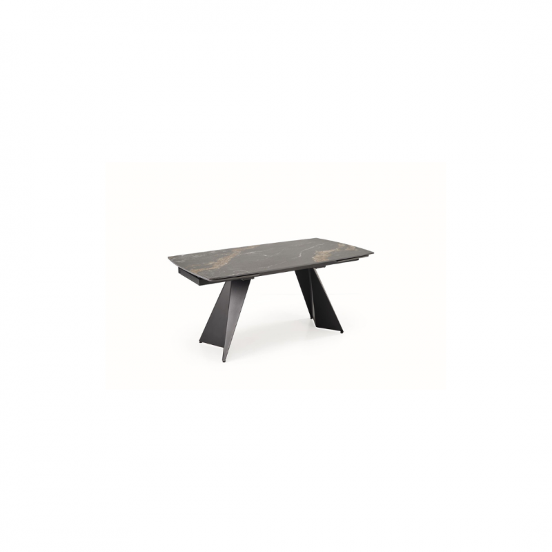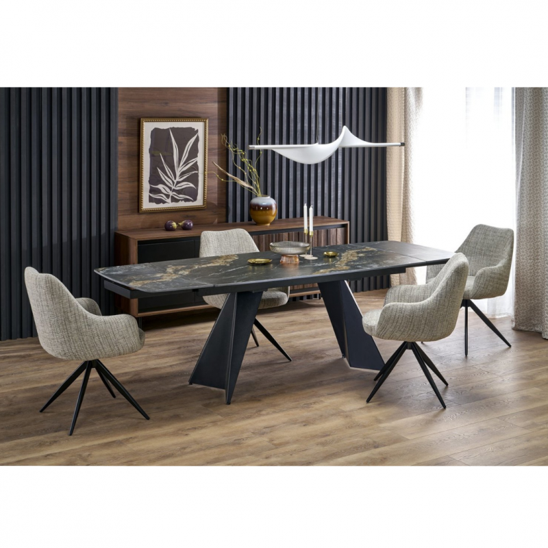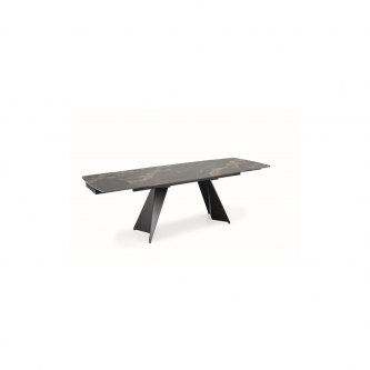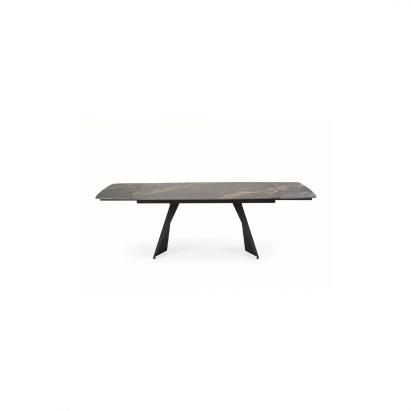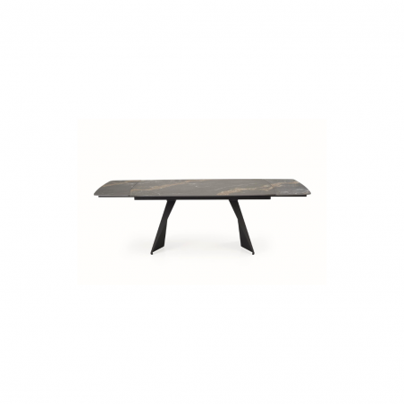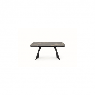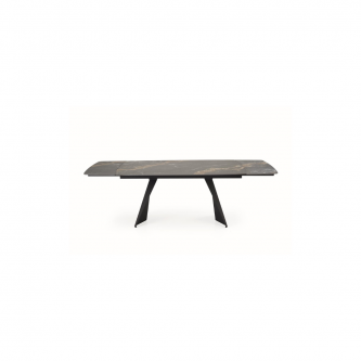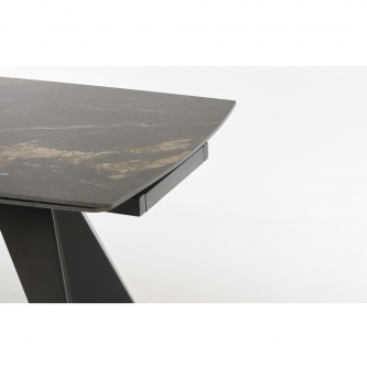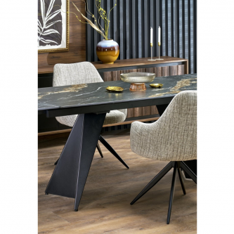 Stół Armani to elegancki i funkcjonalny mebel, który łączy nowoczesny design z wysoką jakością wykonania. Jego rozkładana konstrukcja zapewnia wszechstronność, pozwalając na dostosowanie powierzchni blatu do aktualnych potrzeb. Blat wykonany ze spieku w kolorze czarnego marmuru zachwyca unikalnym wzorem i szlachetnym wyglądem, jednocześnie charakteryzując się wyjątkową trwałością oraz odpornością na zarysowania i wysoką temperaturę. Stabilna podstawa z malowanej proszkowo stali w kolorze czarnym dodaje mu nowoczesnego charakteru i zapewnia solidność konstrukcji. Połączenie luksusowego blatu z minimalistycznymi, ale wyrazistymi nogami sprawia, że stół