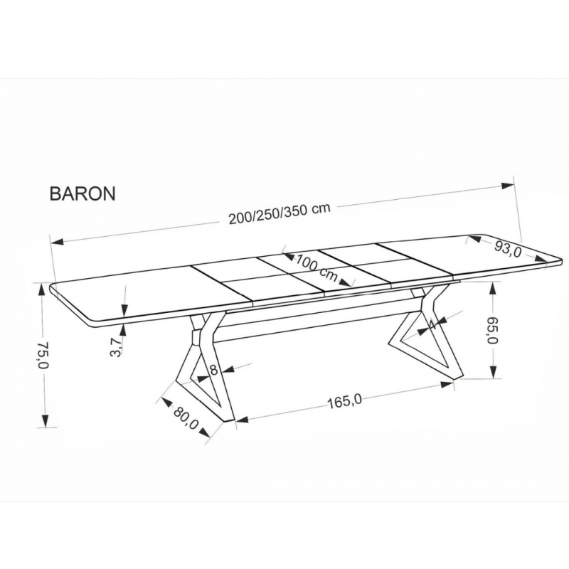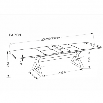 Solidna stalowa noga, malowana proszkowo na czarno, zapewnia stabilność i nowoczesny, industrialny wygląd. Dzięki funkcji rozkładania stół Baron może osiągnąć imponujące rozmiary, co czyni go idealnym wyborem zarówno do codziennych posiłków, jak i większych spotkań rodzinnych czy przyjęć.