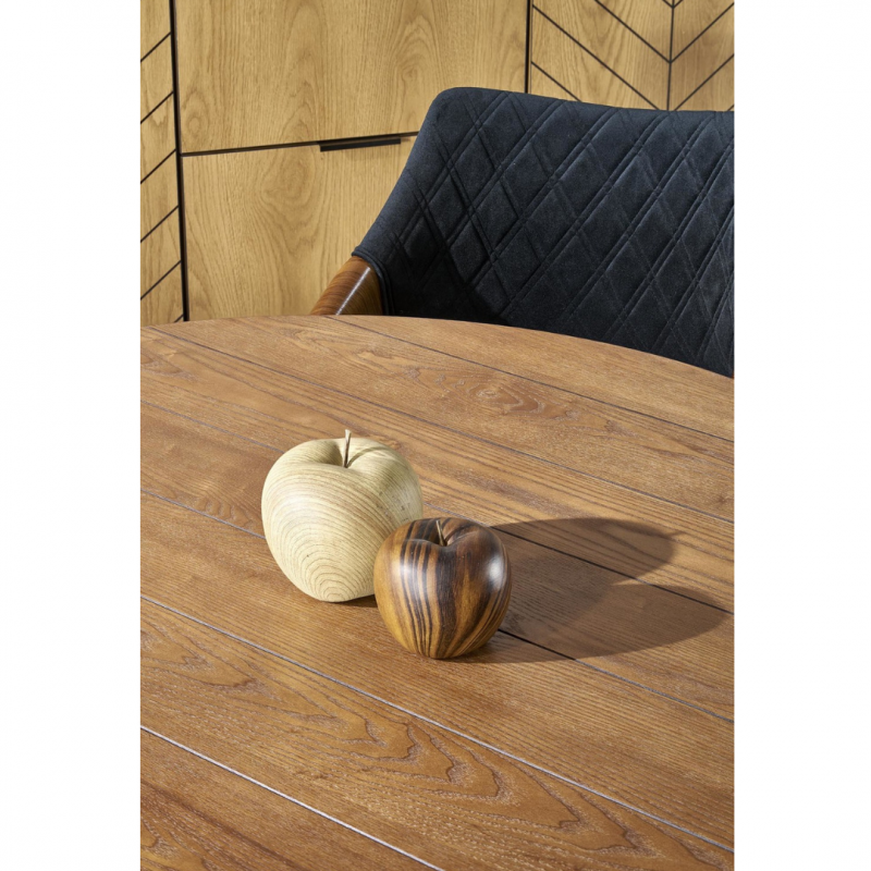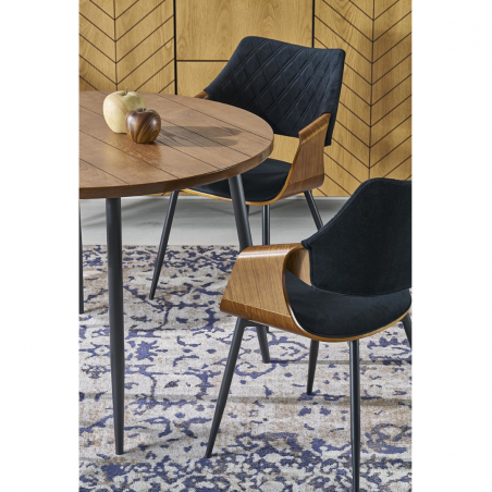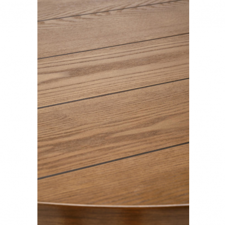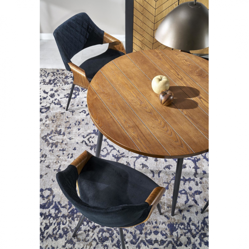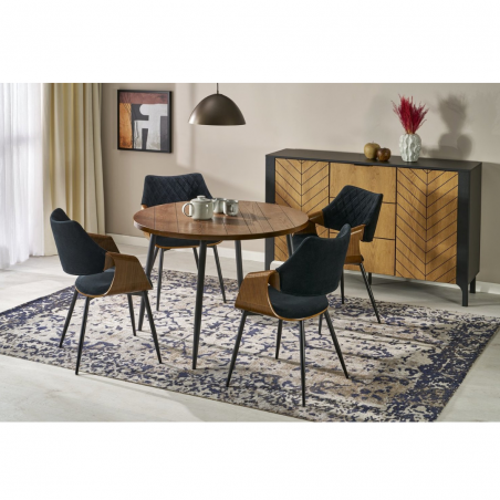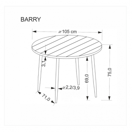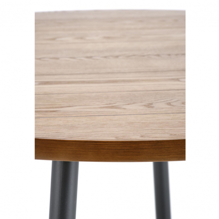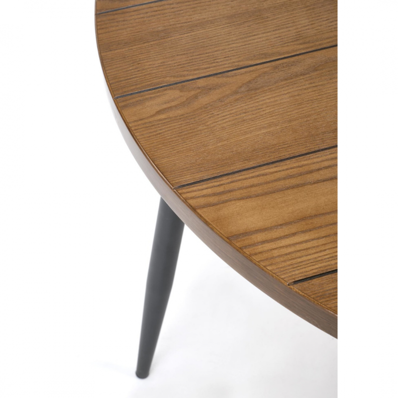 Stół Barry to elegancki i funkcjonalny mebel o okrągłym blacie, który doskonale wpisuje się w nowoczesne i loftowe wnętrza. Blat wykonany jest z płyt MDF, których powierzchnia została pokryta wysokiej jakości melaminą, imitującą naturalne deski. Ciepły, orzechowy odcień blatu nadaje stołowi przytulny i stylowy wygląd.