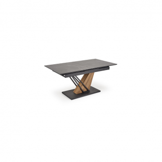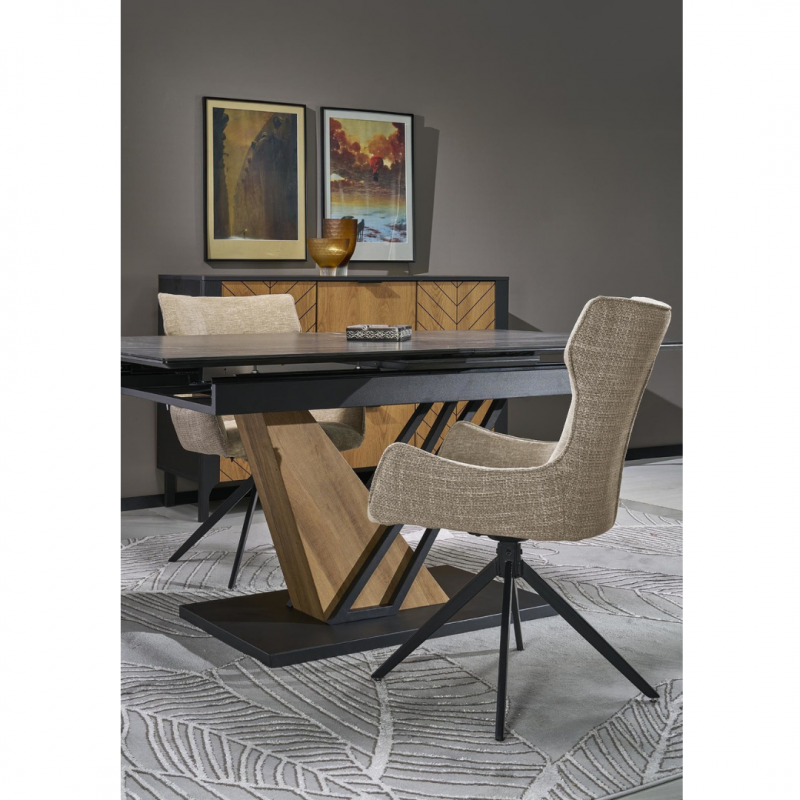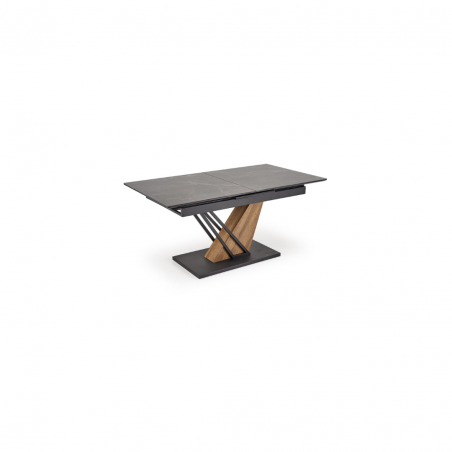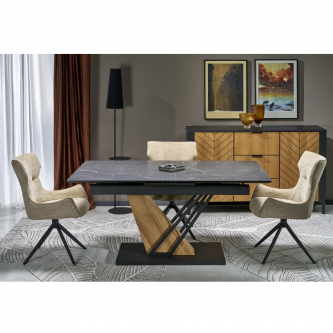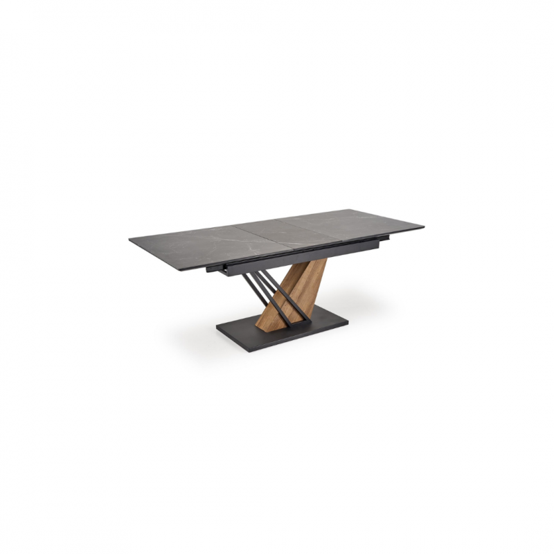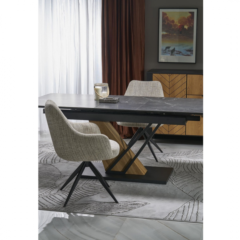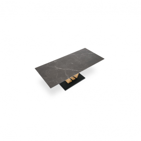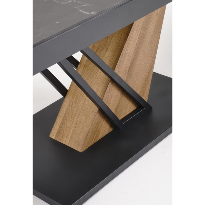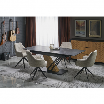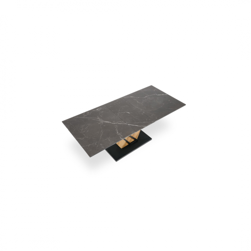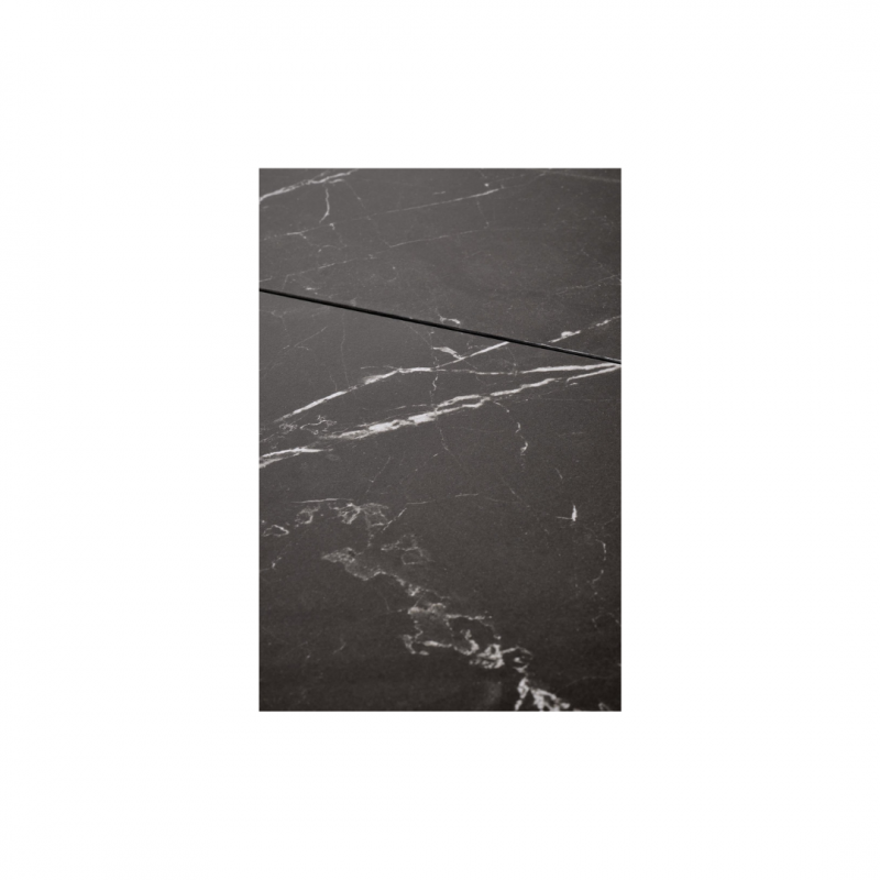 Blat wykonany jest z wytrzymałego spieku, w kolorze czarnego marmuru, które nadaje stołowi luksusowego charakteru i eleganckiej głębi.