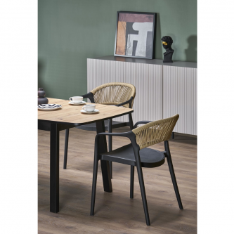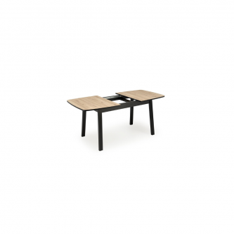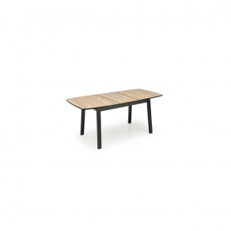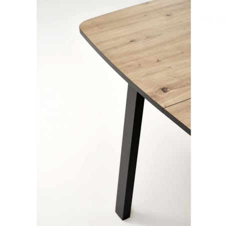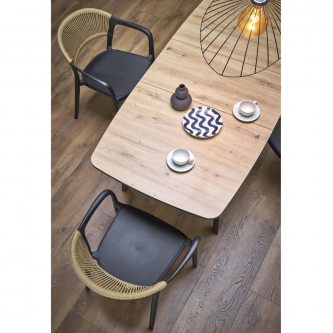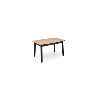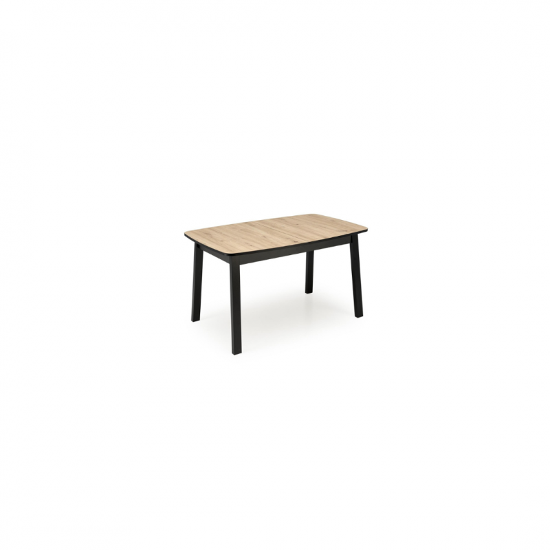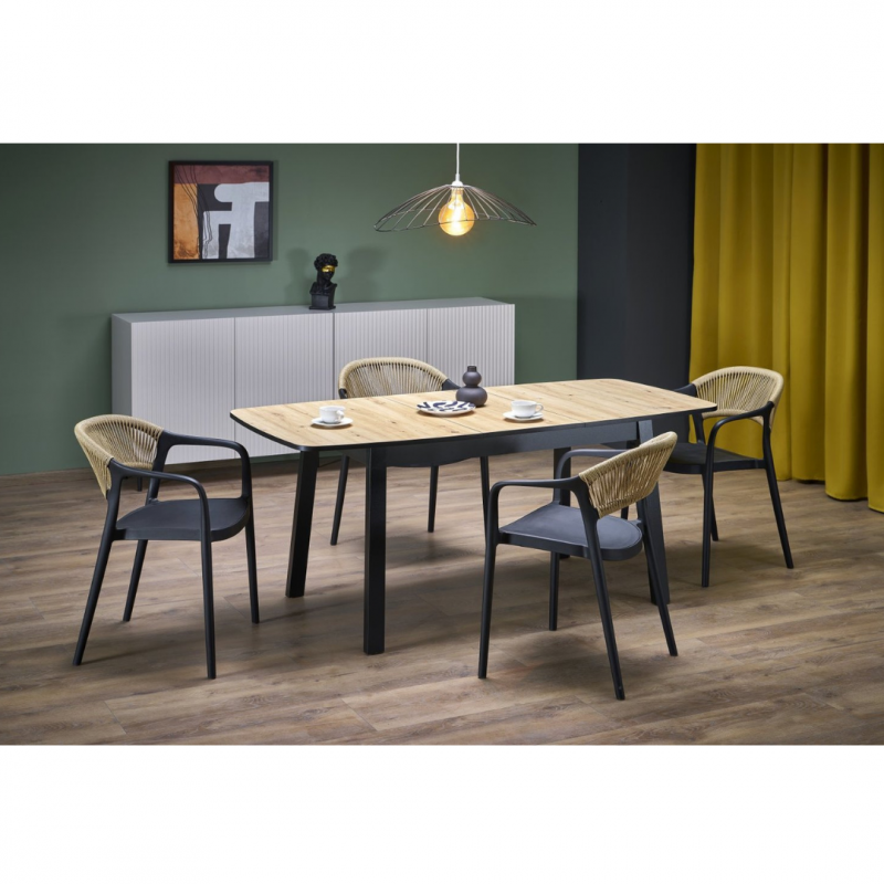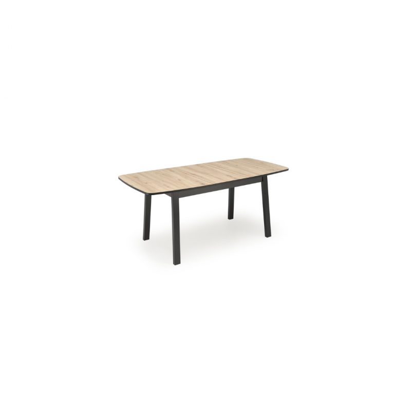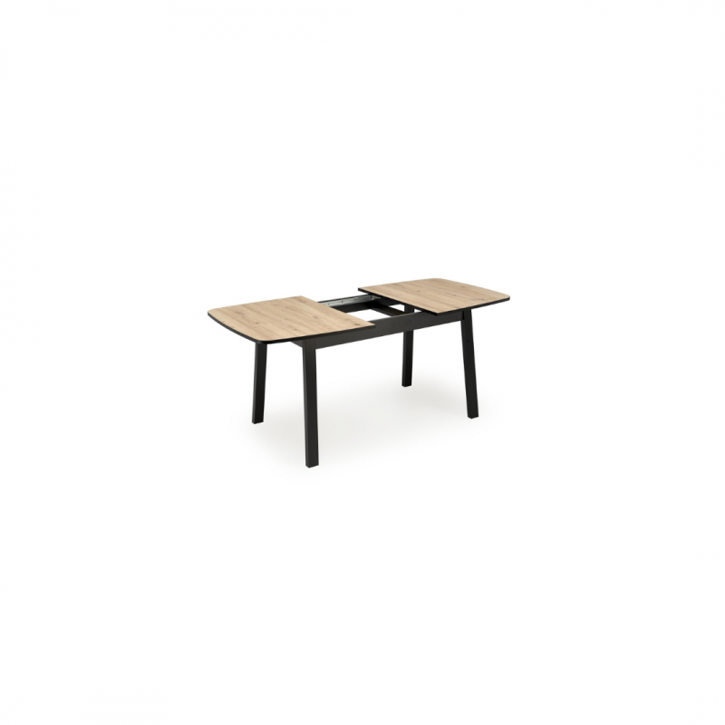 Stół Barill to nowoczesny i funkcjonalny mebel, który doskonale sprawdzi się zarówno w jadalni, jak i w salonie. Jego rozkładana konstrukcja pozwala na łatwe powiększenie powierzchni blatu, co czyni go idealnym rozwiązaniem na spotkania rodzinne czy przyjęcia. Wykonany z trwałej płyty meblowej laminowanej oraz MDF okleinowanego, zapewnia solidność i długowieczność użytkowania. Blat w ciepłym odcieniu dąb artisan wprowadza naturalny, przytulny klimat do wnętrza, natomiast czarne nogi dodają całości eleganckiego, nowoczesnego charakteru. Połączenie tych dwóch kolorów tworzy harmonijny kontrast, który wpasuje się zarówno w klasyczne, jak i bardziej industrialne aranżacje.