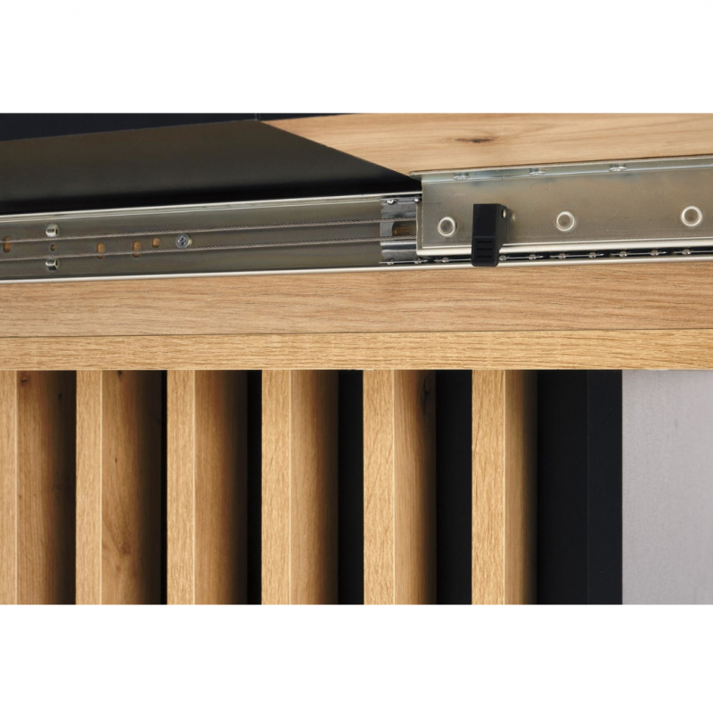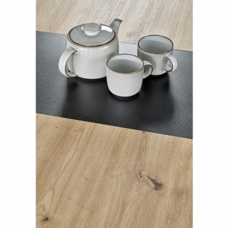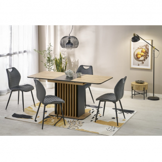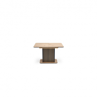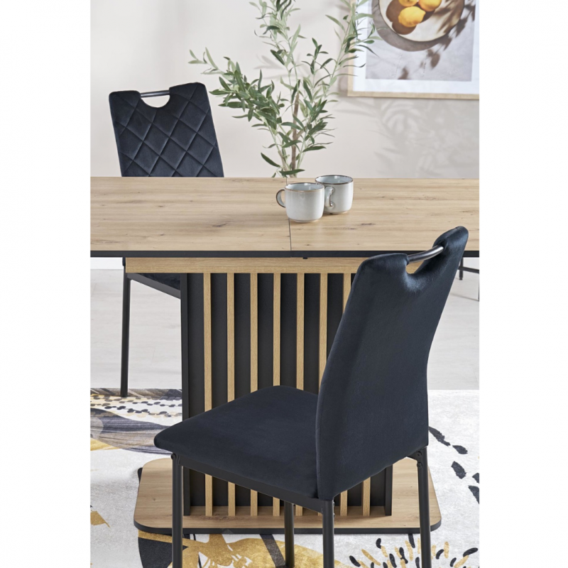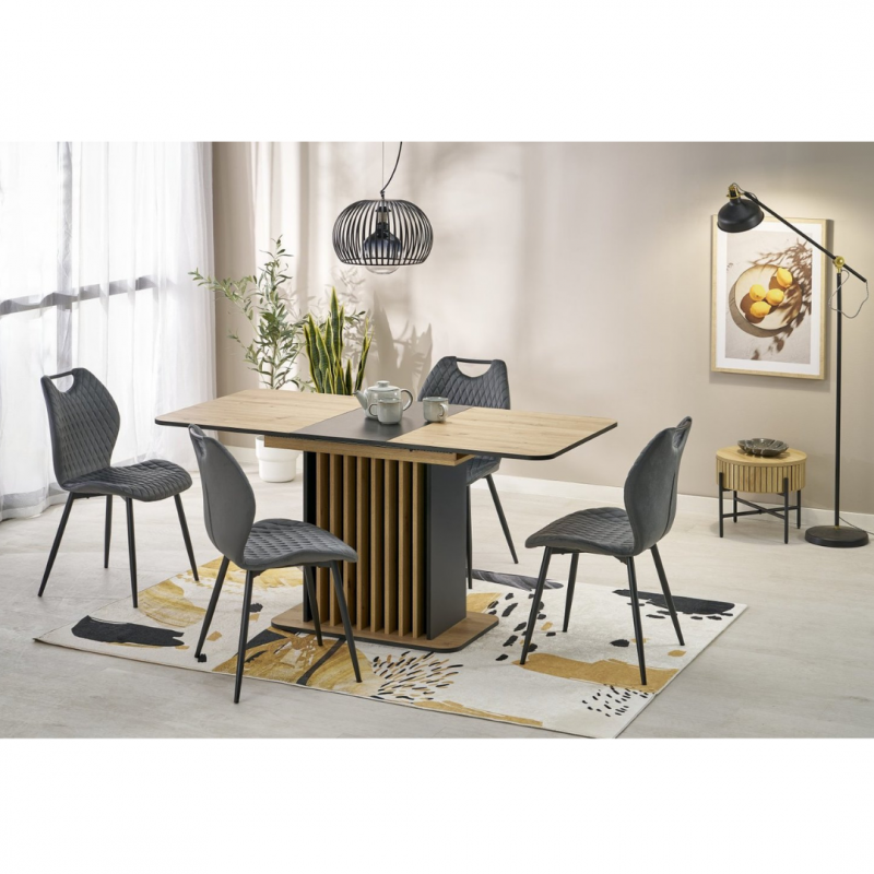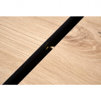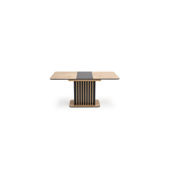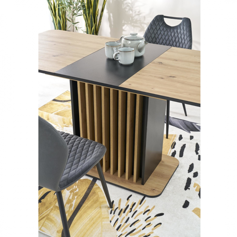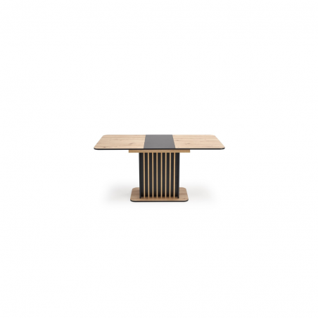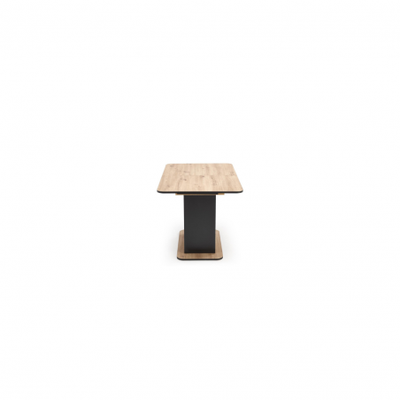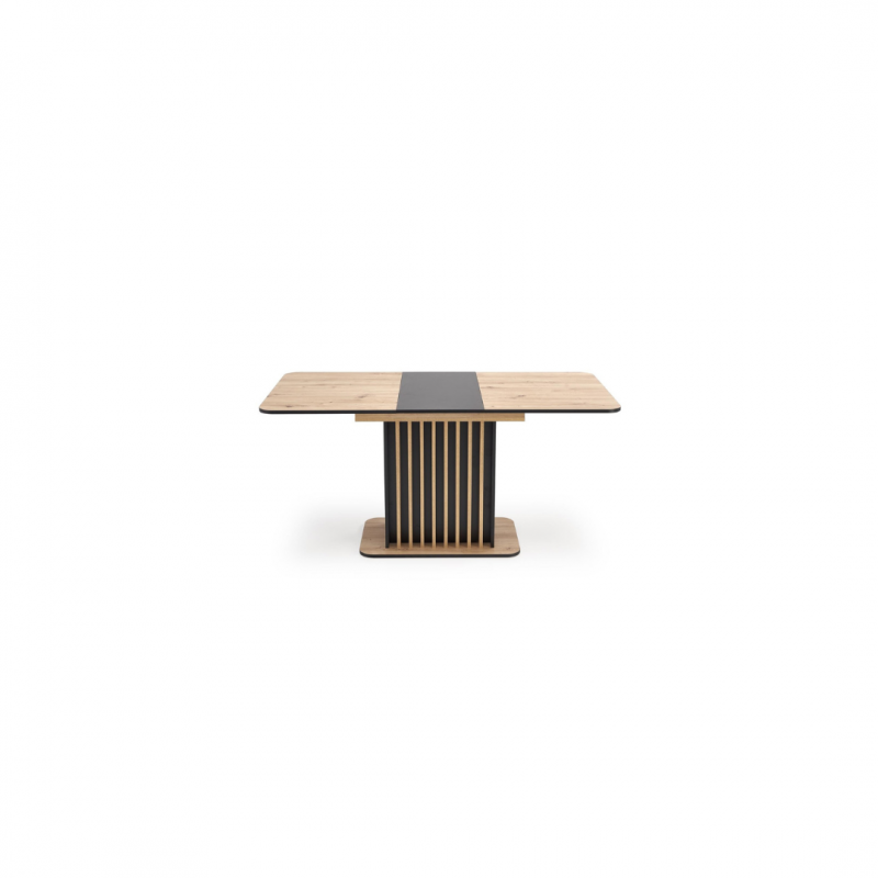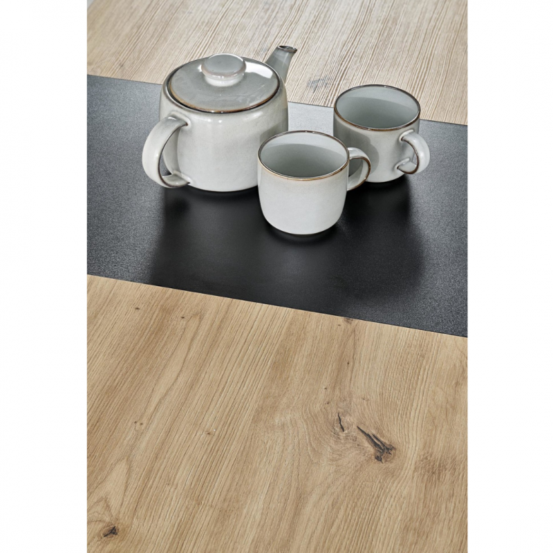 Blat stołu wykonany jest z płyty meblowej laminowanej, co gwarantuje trwałość oraz łatwość w utrzymaniu czystości. Kolor blatu to połączenie ciepłego odcienia dębu artisan z eleganckim czarnym akcentem, co tworzy elegancki kontrast i pasuje do różnych aranżacji wnętrz.