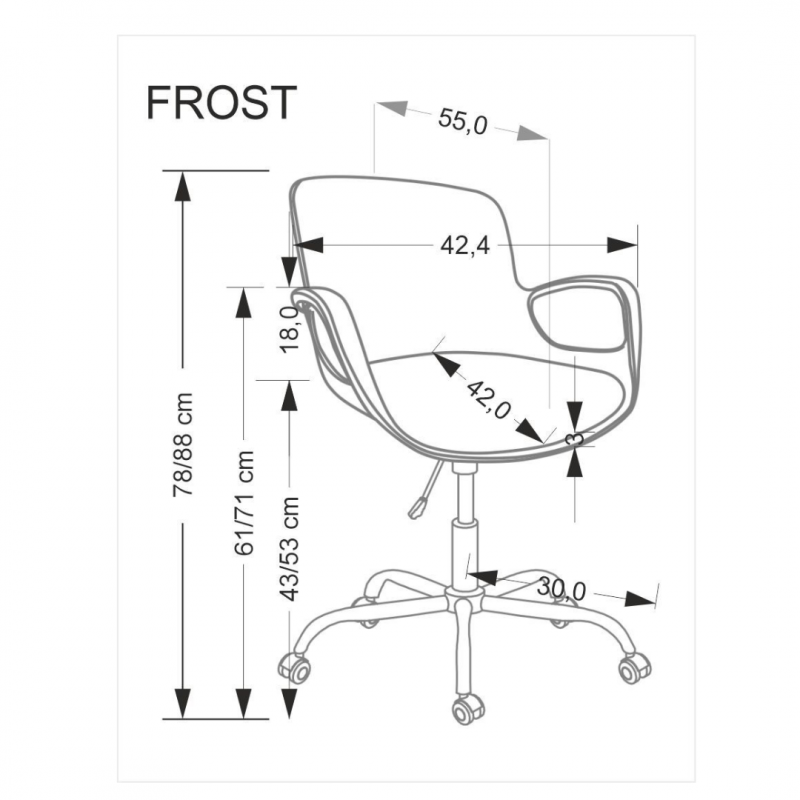 Fotel obrotowy FROST o wymiarach: 58/55/78-88/43-53 cm,