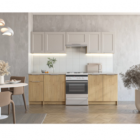 WENDY to zestaw mebli kuchennych o długości 240 cm. Fronty szafek górnych wykonane są z MDF, co zapewnia trwałość i elegancki wygląd. Dolne szafki mają prostą formę i są w kolorze dębu Cremona, co wprowadza do wnętrza ciepło i naturalny charakter. Górne szafki w kolorze kaszmiru wyróżniają się subtelnymi frezami na frontach, co dodaje im elegancji i wyrafinowanego stylu. Blat jest popielaty, tworząc nowoczesny kontrast z ciepłymi odcieniami szafek.