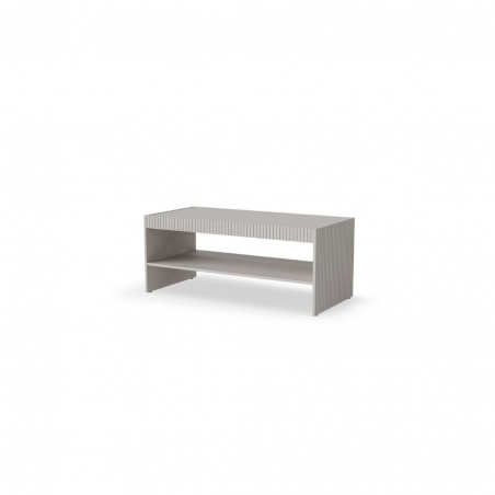 Fronty mebli wyróżniają się charakterystycznymi ryflami, które nadają im nowoczesny i subtelny wygląd. Dzięki zastosowaniu tego elementu, meble stają się wyjątkowe i pełne klasy. Materiały, z których zostały wykonane, to płyta meblowa laminowana, MDF foliowany oraz stal malowana proszkowo. Każdy z tych materiałów gwarantuje trwałość, łatwość w utrzymaniu czystości i odporność na codzienne użytkowanie.