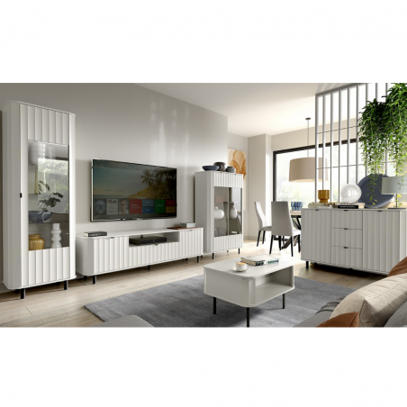 Novado to kolekcja mebli do salonu, która łączy w sobie elegancję i funkcjonalność. Jej wyróżnikiem są frezowane, foliowane fronty z MDF-u, które nadają wnętrzu wyjątkowego charakteru. Dzięki dwóm ponadczasowym kolorom – klasycznej bieli i modnemu Clay Gray – Novado wpisuje się w różne style aranżacyjne, od nowoczesnych po minimalistyczne.