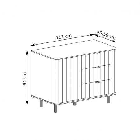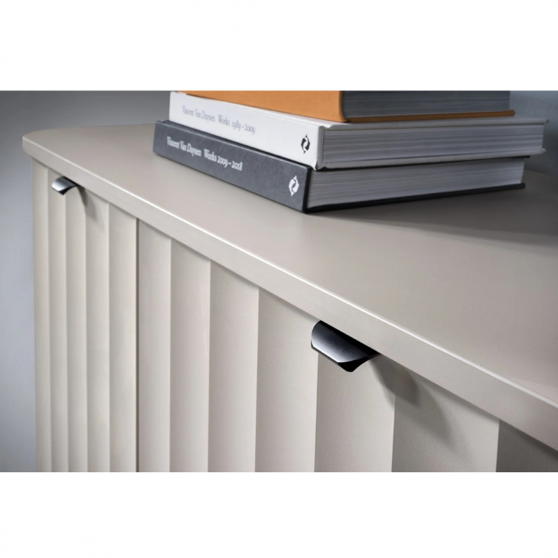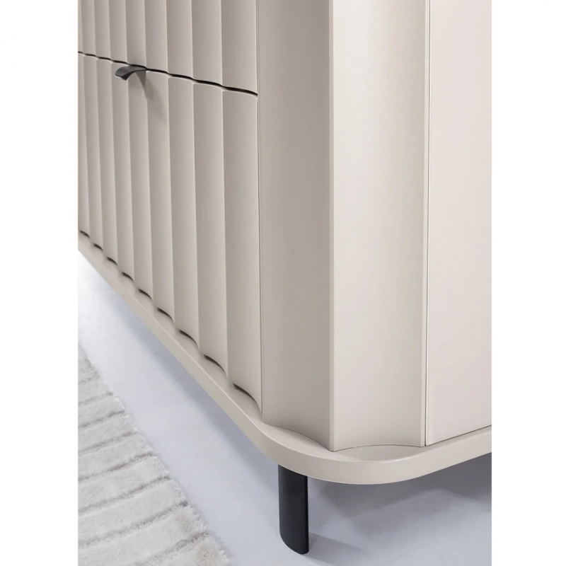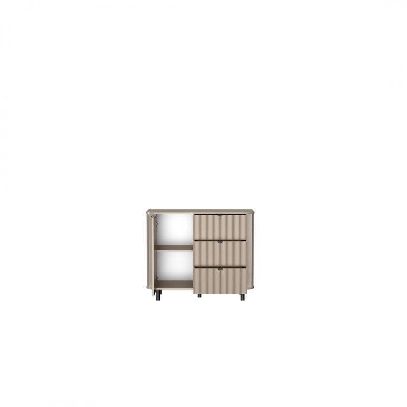 Komoda NOVADO-3 to eleganckie i funkcjonalne rozwiązanie do nowoczesnych wnętrz. Dzięki kompaktowej długości 117 cm świetnie sprawdzi się w salonie, sypialni lub przedpokoju. Wyposażona w trzy pojemne szuflady oraz zamykaną szafkę z półką, zapewnia wygodne przechowywanie różnych przedmiotów. Stylowe frezowane fronty MDF, zaokrąglone blaty oraz czarne metalowe nogi i uchwyty nadają jej wyjątkowego charakteru. Dodatkowym atutem jest system cichego domyku, który zwiększa komfort użytkowania. Dostępna w dwóch uniwersalnych kolorach – klasycznej bieli i eleganckim odcieniu Clay Gray.