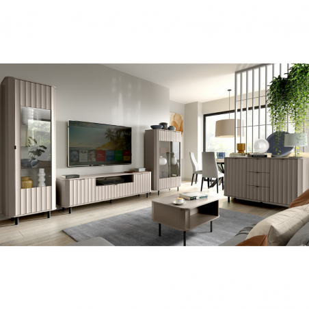 Novado to kolekcja mebli do salonu, która łączy w sobie elegancję i funkcjonalność. Jej wyróżnikiem są frezowane, foliowane fronty z MDF-u, które nadają wnętrzu wyjątkowego charakteru. Dzięki dwóm ponadczasowym kolorom – klasycznej bieli i modnemu Clay Gray – Novado wpisuje się w różne style aranżacyjne, od nowoczesnych po minimalistyczne.