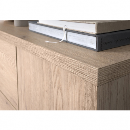 Ciepły odcień dębu cremona podkreśla naturalny charakter komody, a delikatna struktura drewna nadaje jej wyjątkowego uroku. Zaokrąglone krawędzie dodają bryle lekkości i bezpieczeństwa, natomiast subtelne uchwyty wpisują się w stylistykę kolekcji, nie odciągając uwagi od piękna materiału.
