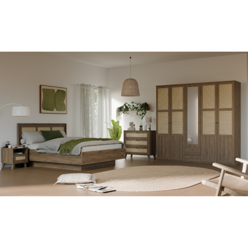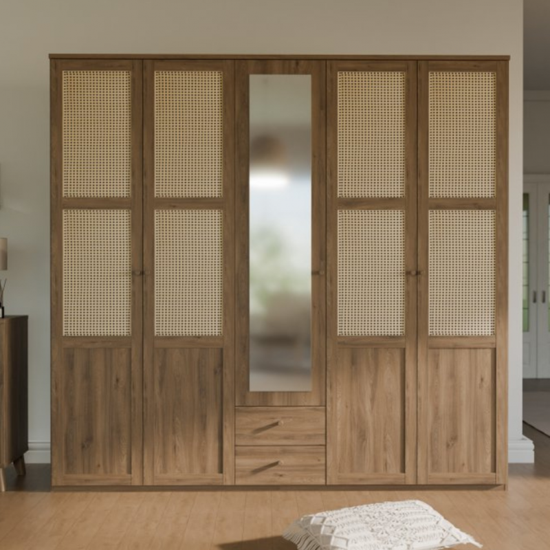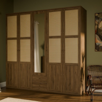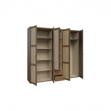 Szafa GLENKEEN to sposób na maksymalne wykorzystanie dostępnej przestrzeni. Wydzielono w niej 3 strefy - 2 szerokie przestrzenie z drążkiem na wieszaki i półką oraz jedną wąską przestrzeń z drążkiem, półką i szufladami. Potrzebujesz więcej półek? Mamy dedykowane półki do wszystkich 3 stref - możesz zaprojektować wnętrze szafy po swojemu. Tym, co wyróżnia mebel jest plecionka wiedeńska, którą wykorzystano na frontach, przez co doskonale wpisuje się w styl boho lub japandi. Połącz szafę z innymi meblami z tej kolekcji, aby stworzyć przytulną i spójną aranżację.