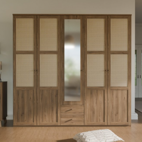 - Mebel łączy dekor Dąb Valencia i rattanową plecionkę wiedeńską