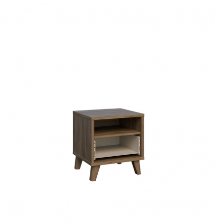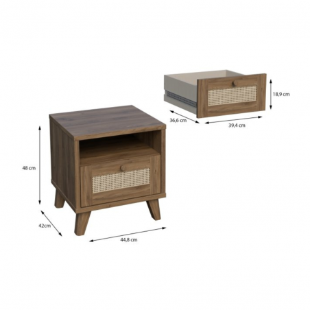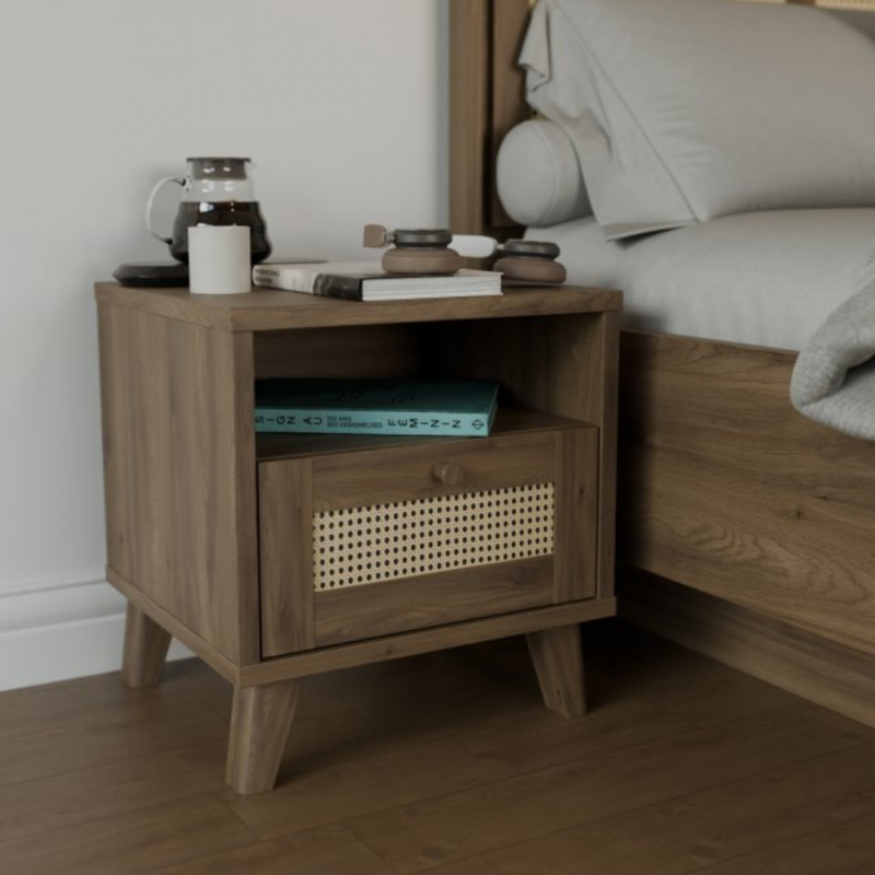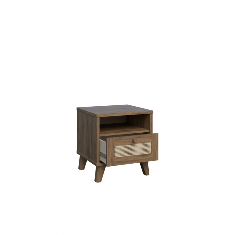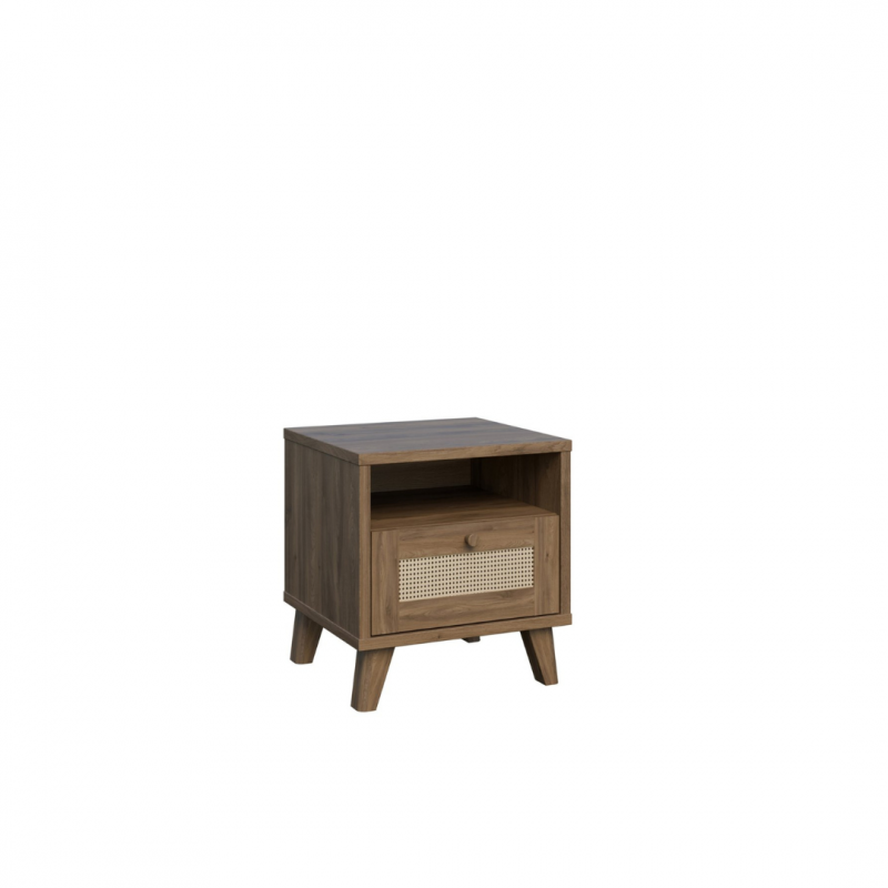 Urządzając sypialnię nie może zabraknąć w niej łóżka, szafy i… szafki nocnej GLENKEEN. Podręczna szuflad ai otwarta przestrzeń pomogą uporządkować leki i kosmetyki. Na blacie możesz ustawić ładowarkę indukcyjną i odłożyć telefon. Lampka też się zmieści. Tym, co wyróżnia mebel jest plecionka wiedeńska, którą wykorzystano na froncie, przez co doskonale wpisuje się w styl boho lub japandi. Stylową bryłę osadzono na skośnie montowanych nogach, przez co całość nabiera wizualnej lekkości.