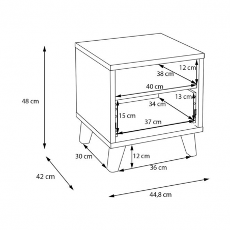 - Szafka nocna ma wymiary 44,8 cm szerokości, 48 cm wysokości i 41,5 cm głębokości
