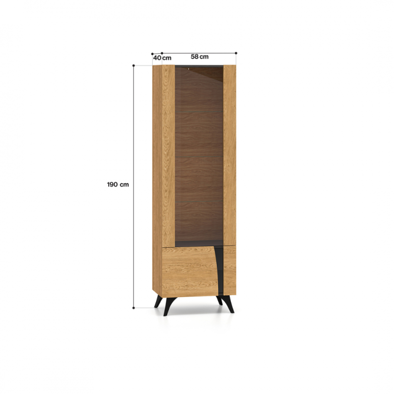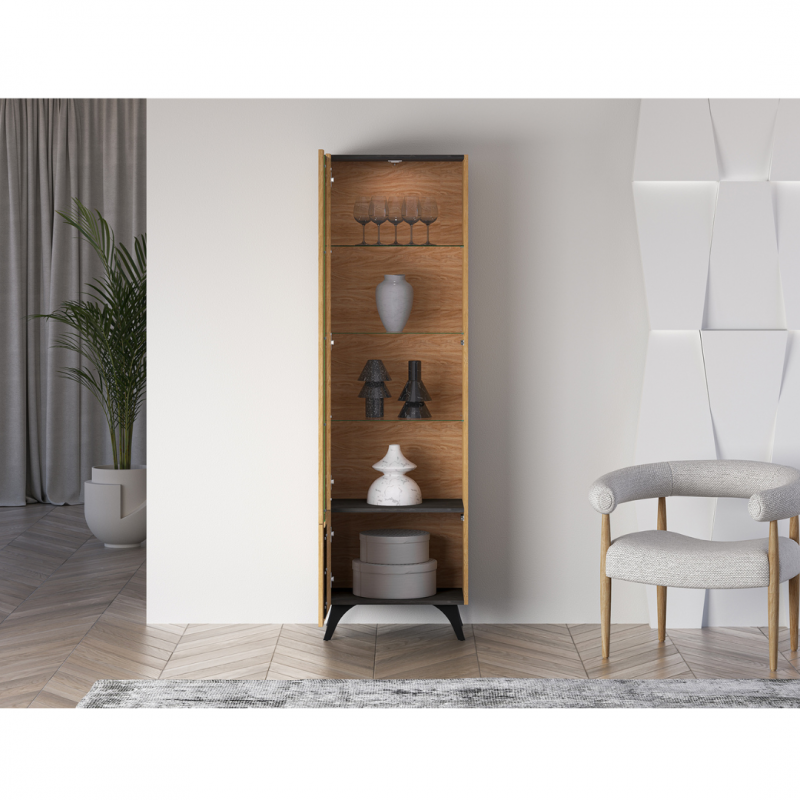 Wysoka witryna Toscania 02 to mebel, dzięki któremu wyeksponujesz swoje ulubione przedmioty. Trzy szklane półki dzielą przestrzeń za przeszklonymi drzwiczkami na cztery wnęki. Ustawisz w nich kieliszki, kolekcję porcelany lub pamiątki z podróży. Jeśli chcesz dodatkowo podkreślić ulubione gadżety wybierz proponowane przez nas ledowe podświetlenie półek. Wydobywające się z witryny światło dyskretnie ociepli całe Twoje wnętrze. Dolną część mebla tworzy schowana wnęka, w której przechowasz zastawę stołową lub obrusy. Witryna Toscania 02 łączy ze sobą wysoką funkcjonalność ze współczesnym designem. Bezuchwytowe fronty dodatkowo podkreślają nowoczesną stylistykę mebla, który spełni Twoje oczekiwania.