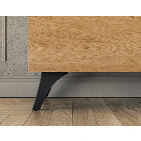 Toscania to kolekcja eleganckich mebli do pokoju dziennego. Bryły stworzone są z doskonale komponujących się wzorów płyt – wyraźnego, dębowego usłojenia Baltic Dune oraz kontrastującego, czarnego Jesionu Portland. Klasyczne usłojenie drewna przełamane jest czarną, szklaną wstawką w połysku. Oryginalnie zaokrąglone fronty oraz niebanalnie wyprofilowane nóżki nadają bryłom odpowiedni rytm, dodający wnętrzu dynamiki i charakteru. Szeroka gama brył pozwoli zaaranżować zarówno mały apartament w centrum miasta jak i salon w dużym domu na przedmieściach.