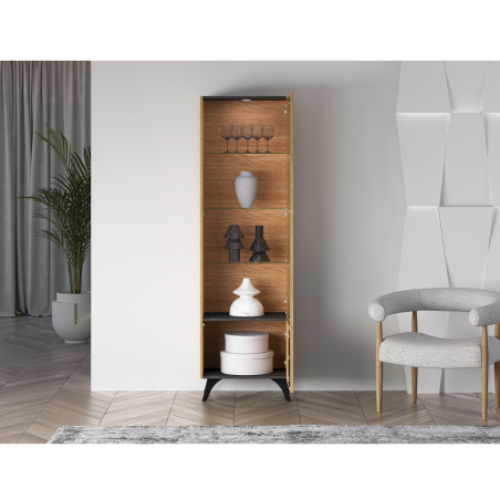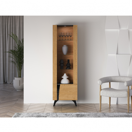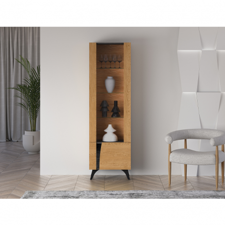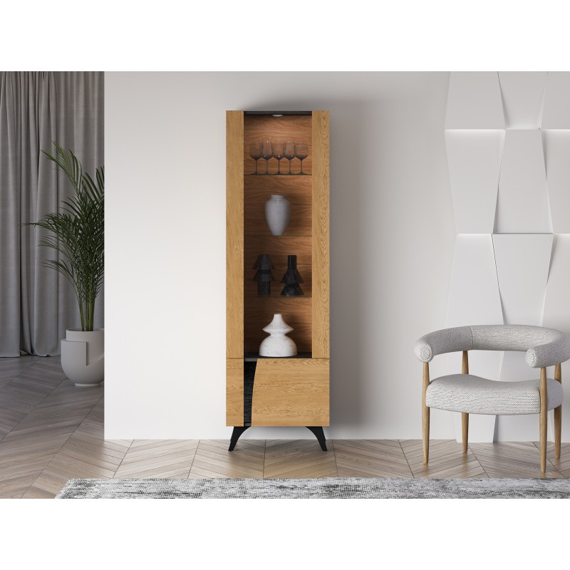 Wysoka witryna Toscania 02 to mebel, dzięki któremu wyeksponujesz swoje ulubione przedmioty. Trzy szklane półki dzielą przestrzeń za przeszklonymi drzwiczkami na cztery wnęki. Ustawisz w nich kieliszki, kolekcję porcelany lub pamiątki z podróży. Jeśli chcesz dodatkowo podkreślić ulubione gadżety wybierz proponowane przez nas ledowe podświetlenie półek. Wydobywające się z witryny światło dyskretnie ociepli całe Twoje wnętrze. Dolną część mebla tworzy schowana wnęka, w której przechowasz zastawę stołową lub obrusy. Witryna Toscania 02 łączy ze sobą wysoką funkcjonalność ze współczesnym designem. Bezuchwytowe fronty dodatkowo podkreślają nowoczesną stylistykę mebla, który spełni Twoje oczekiwania.